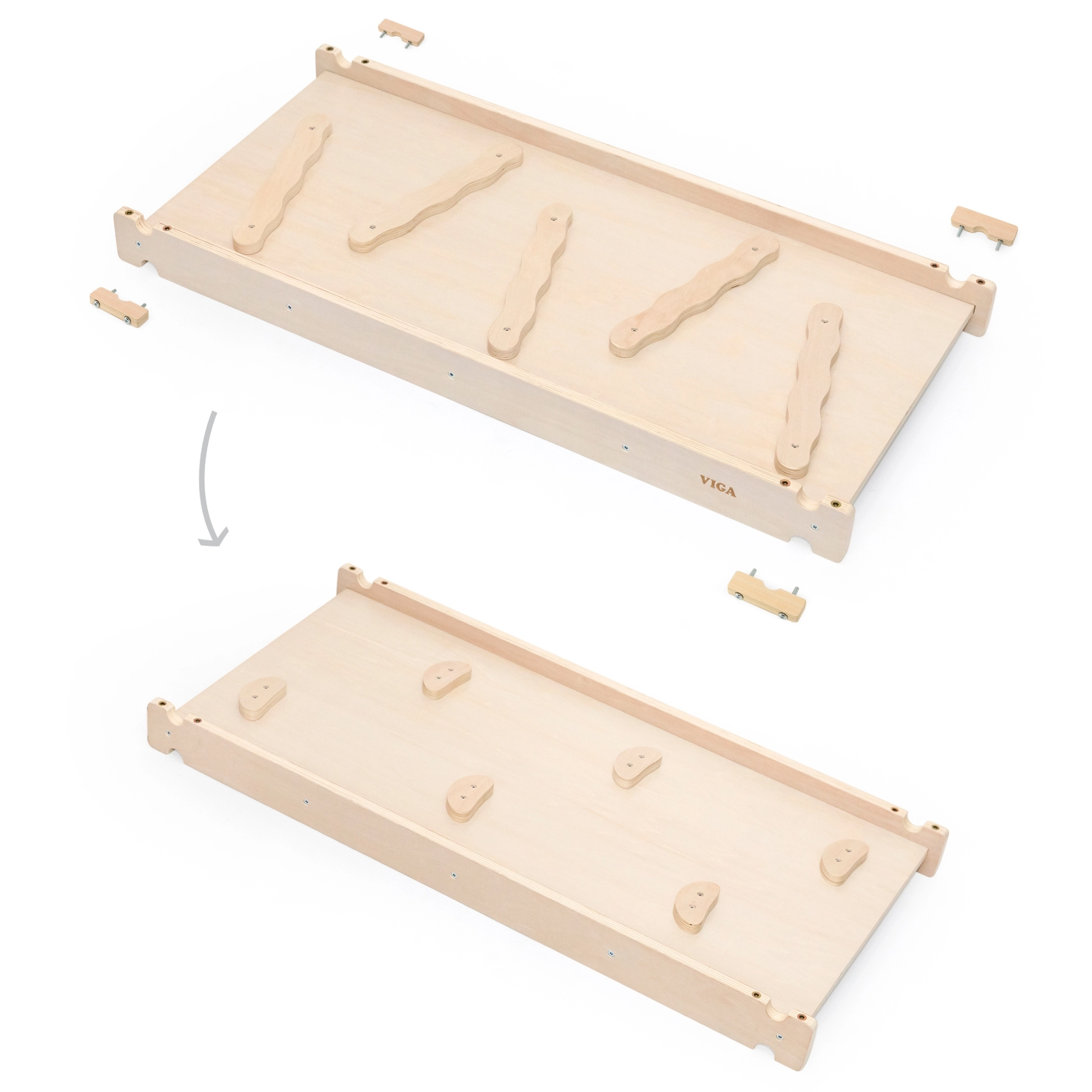 Jedna strana za glatko klizanje i balansirano hodanje, druga s prihvatima kao motivirajući penjački zid za svakodnevno kretanje.