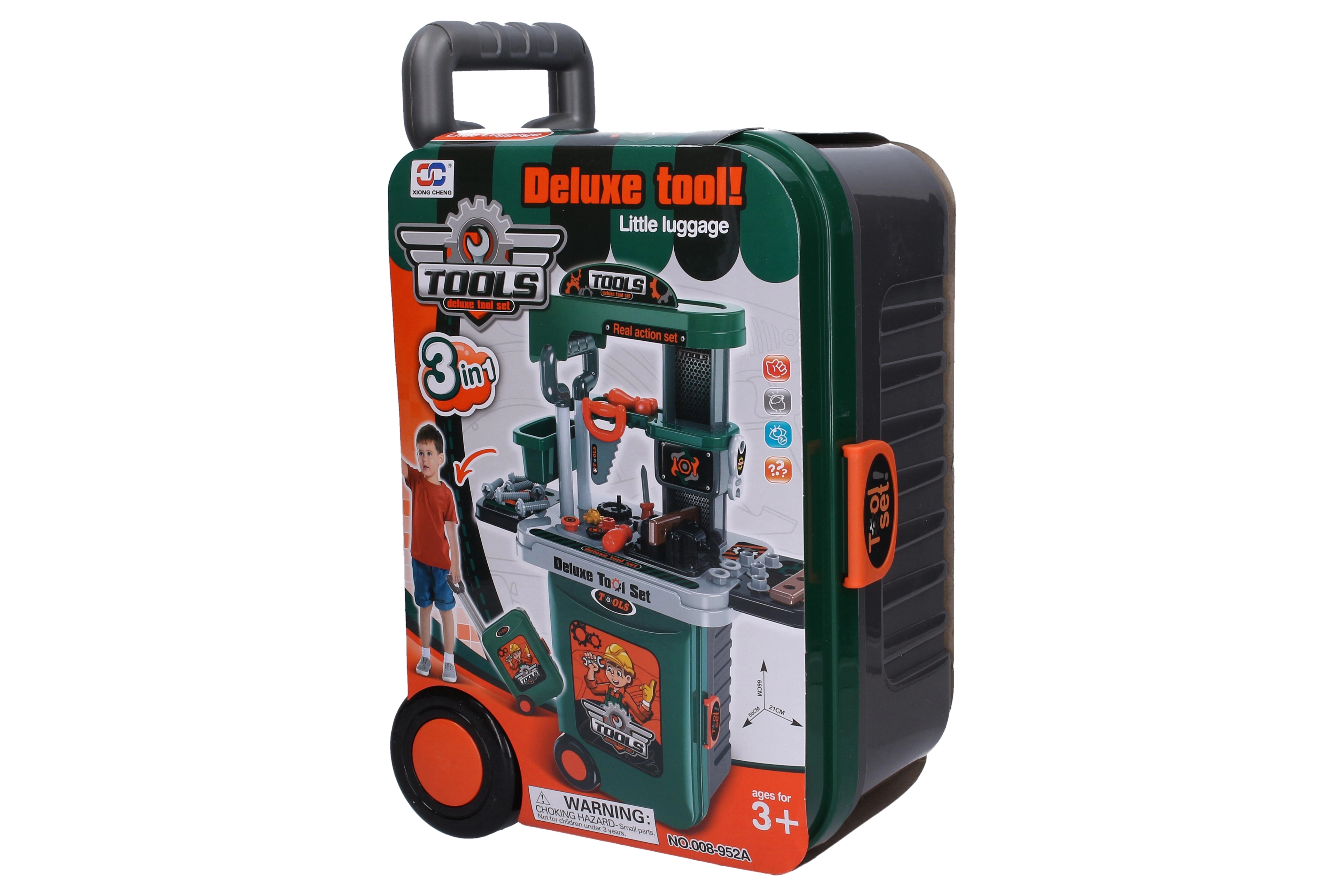 Praktičan i zabavan set za male majstore – dječji kovčeg s alatom sa stolom veličine 38 cm. Kovčeg je na kotačićima s izvlačnom ručkom za jednostavno prenošenje i može se pretvoriti u radni stolić. U kompletu je bogata oprema uključujući alat, vijke, zupčanike i stegu.