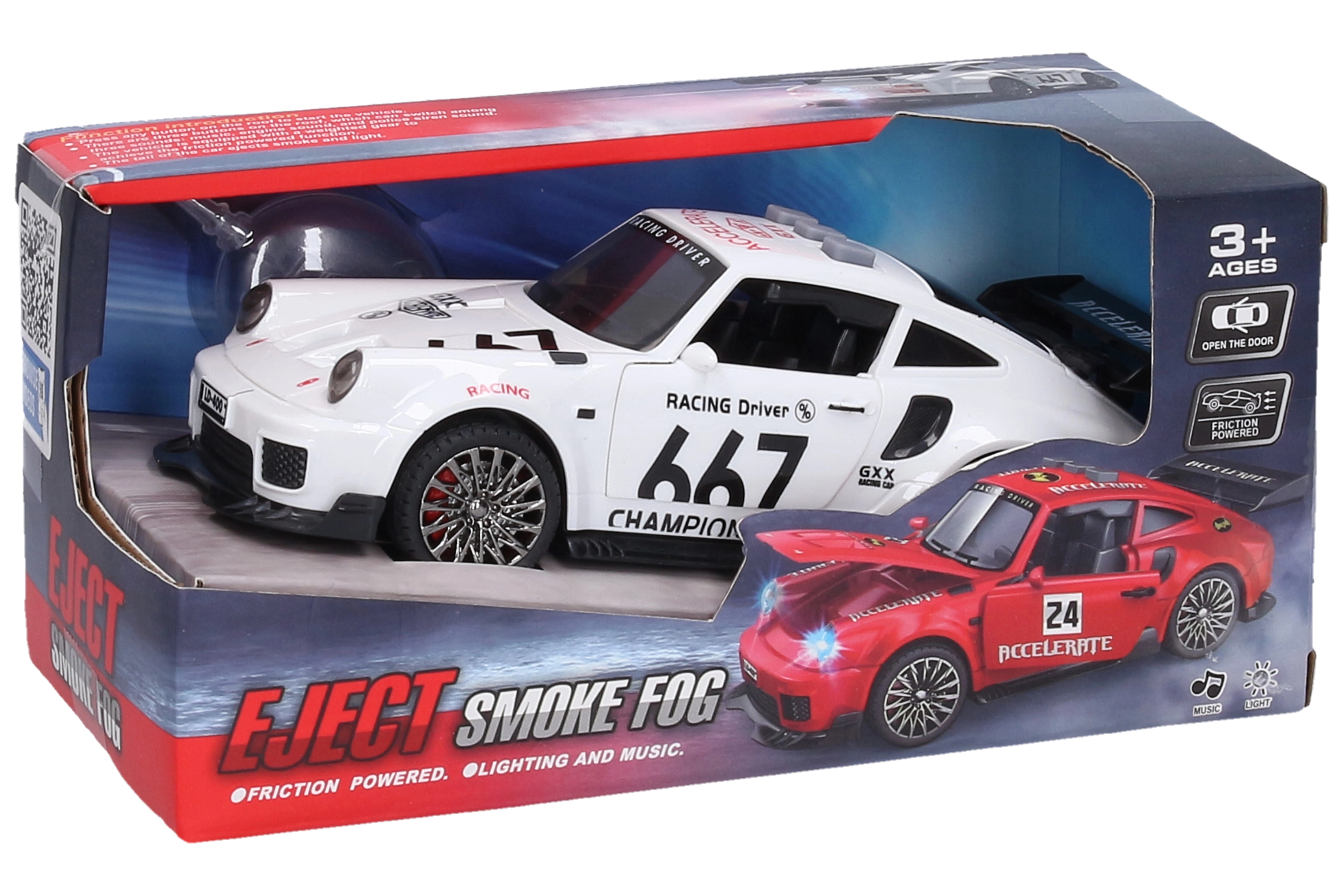Uživajte u dinamičnoj vožnji s ovim kompakt­nim trkaćim autom dužine 15 cm, koji nudi svjetlosne, zvučne i dojmljive dimne efekte. Zahvaljujući otvarajućem poklopcu motora i vratima te aktivaciji efekata gumbima na krovu (zvuk motora, sirena, glazba), odličan je izbor za male i velike ljubitelje brzih kotača.