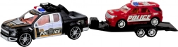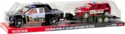 Crni policijski pick-up vuče na prikolici crveni SUV s izraženim natpisima POLICE. Detalji, rotacijska svjetla i slobodno kotrljajući kotači potiču maštovitu igru.