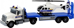 Ovaj policijski transportni kamion stvara potpunu mobilnu bazu za patroliranje, intervencije i spašavanje. Veliki tegljač s prikolicom sigurno prevozi kompaktni helikopter koji zahvaljujući okretajućim rotorima lako “polijeće” i “slijeće” u dječjim scenarijima.