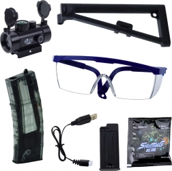 - gel pištolj MK7, 7,4 V Li akumulator, USB kabel, 2 spremnika, optički ciljnik, zaštitne naočale, taktički kundak, pakiranje gel kuglica za namakanje, originalna kutija