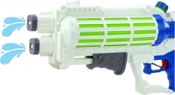 Ovaj snažan vodeni pištolj idealan je za vruće ljetne dane, vrtne zabave i odmor. Veliki kapacitet spremnika 1250 ml smanjuje često dolijevanje i omogućuje dulju neprekinutu akciju. Nakon pumpanja i pritiska na okidač iz cijevi izlijeću odmah dva mlaza vode koji pogađaju cilj precizno i učinkovito.