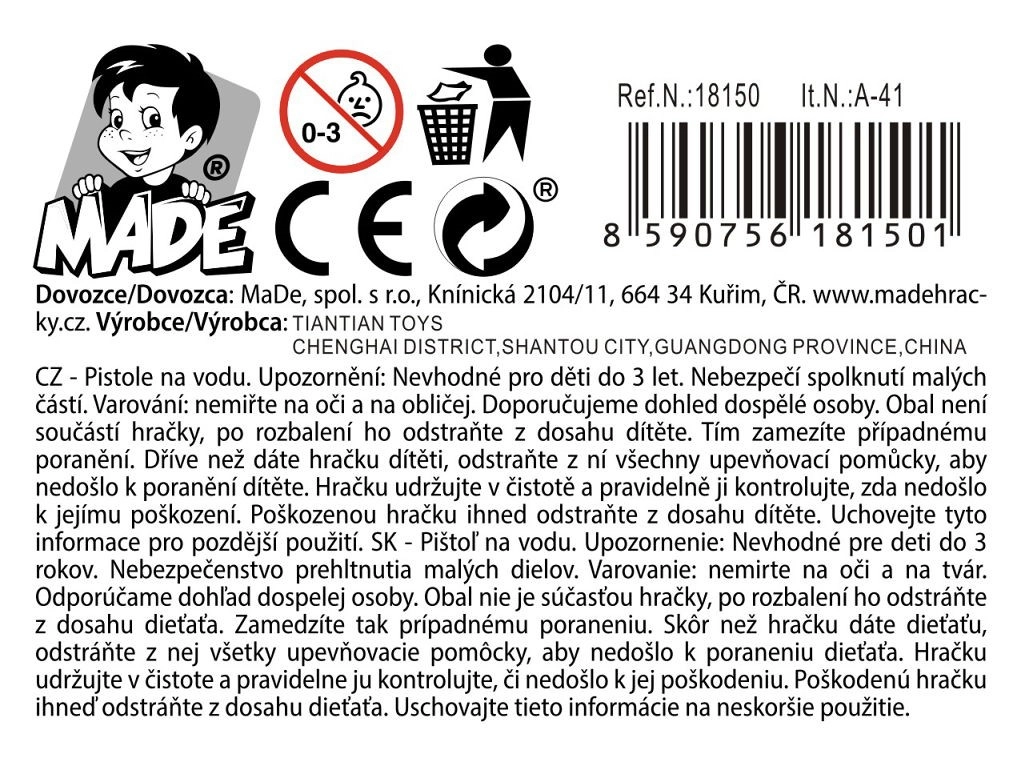 Zabavan i jednostavan za upotrebu vodeni pištolj za djecu od 3 godine, izrađen od kvalitetne plastike. Nudi kompaktne dimenzije 28 × 14 × 4 cm, ne zahtijeva baterije i spreman je za trenutačnu upotrebu. Dostupan u različitim bojama za još razigraniju ljetnu zabavu.