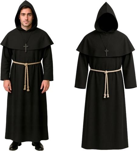 Kompletan kostim redovnika za odrasle s tunikom, kapuljačom, pojasnim užetom i križem osigurava autentičan izgled za Halloween i tematske zabave. Širok kroj za udobnost, realističan dizajn inspiriran redovničkim habitom i jednostavno održavanje čine ovaj kostim odličnim izborom za zabave, karneval i kazališne nastupe.