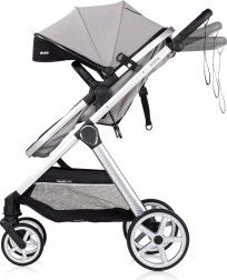 Podesiva ručka od eko kože, prostrana košara, navlaka za noge i torba za presvlačenje. Krović s prozorčićem i sjenilom štiti i omogućuje nadzor nad djetetom.