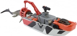Dio seta je veliki mosasaurus s pokretnom čeljusti koji poziva na dramatične scene hvatanja. Ispaljivač harpuna i funkcionalno vitlo dodaju svakoj misiji napetost – prikupite uzorke DNK i sigurno ih dopremite na palubu. Odvojivi spasilački čamac i priloženi Jeep u mjerilu 1:64 proširuju mogućnosti igre i potiču kreativno pripovijedanje.