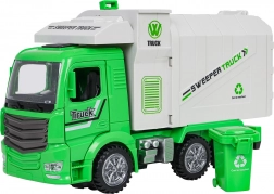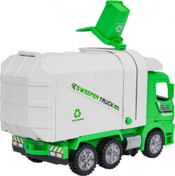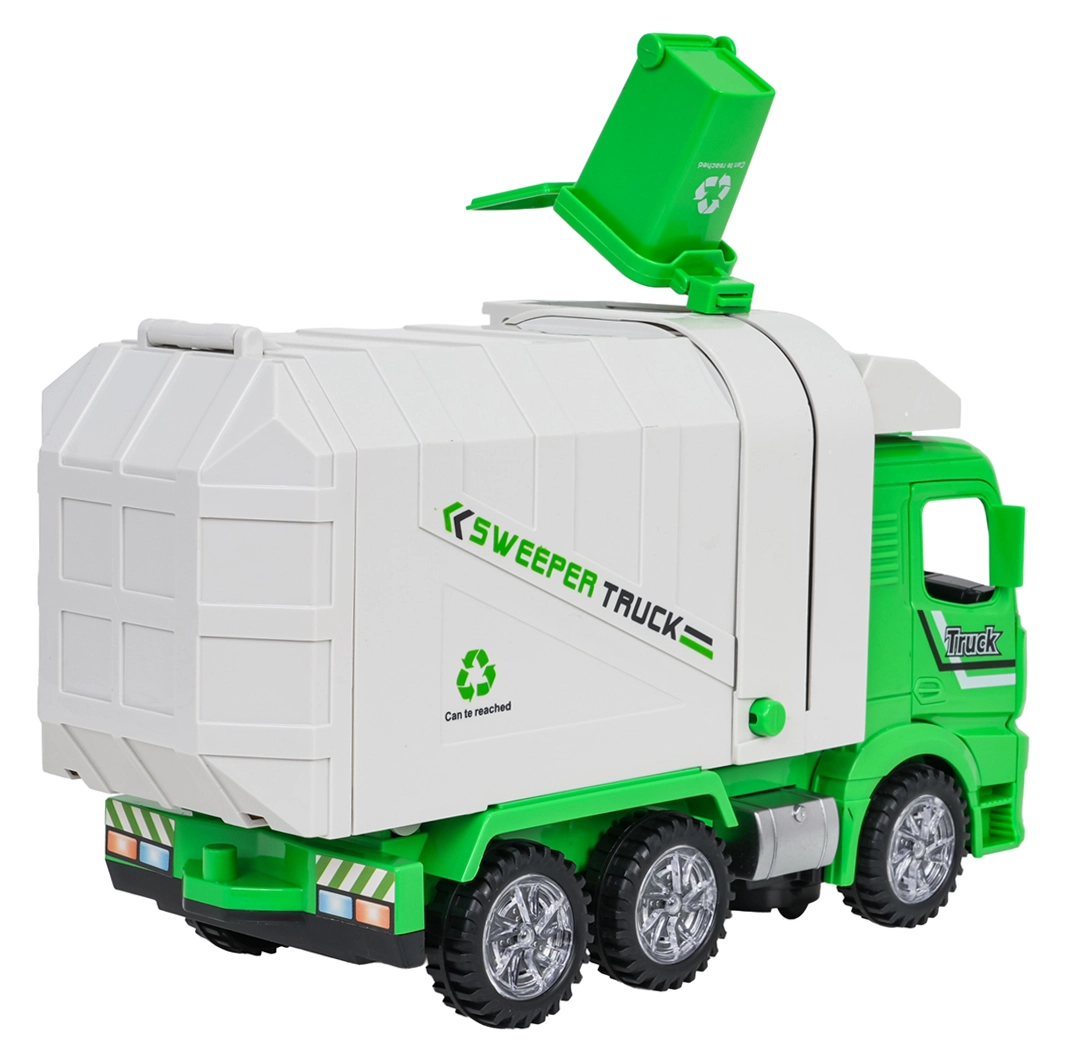 Zvučni efekti poput vožnje, kočenja, trube i vesele melodije čine igru realističnim doživljajem. Priloženu kantu za otpad lako ćete objesiti na bočnu stranu vozila i preklopiti sadržaj u spremnik. Igračka se napaja s 3× AA 1,5 V baterije (nisu uključene u pakiranje).
