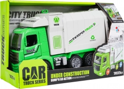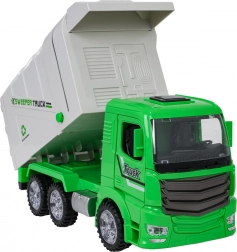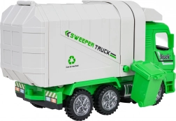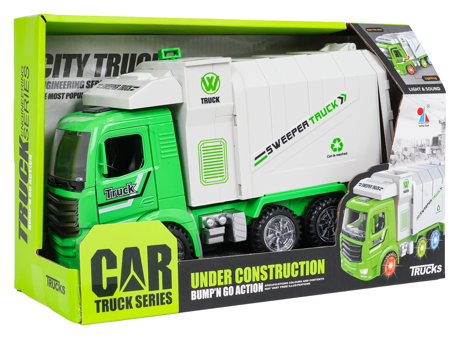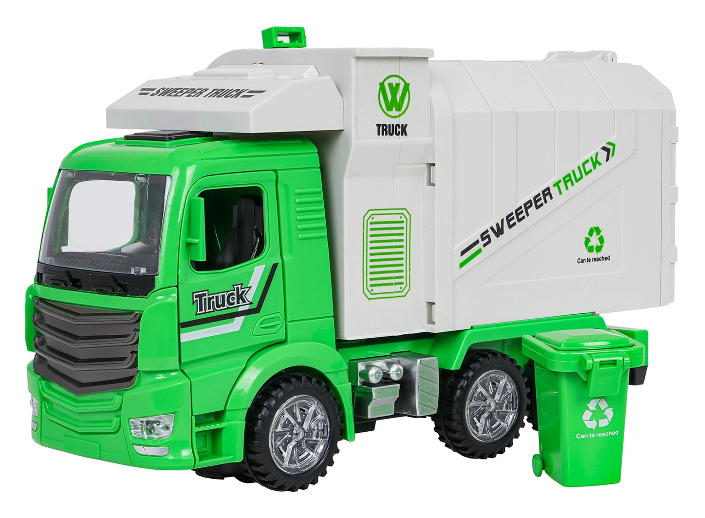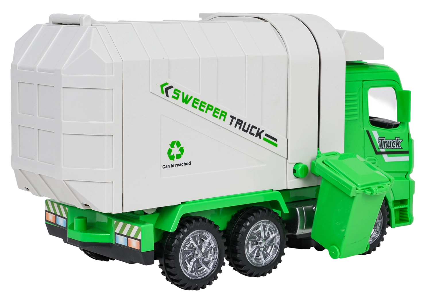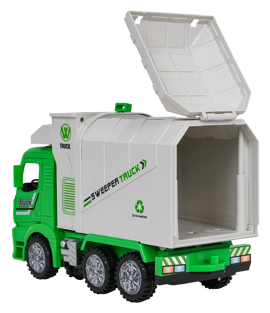 Interaktivni kamion za smeće od kvalitetne plastike oduševit će sve male ljubitelje tehnike. Vozilo se može kretati u svim smjerovima zahvaljujući donjem okretnom kotačiću, pri vožnji svijetle prednja svjetla i osvijetljeni kotači. Vrata kabine se otvaraju, kontejner se može podizati i spuštati, kao i otvoriti njegov stražnji poklopac.