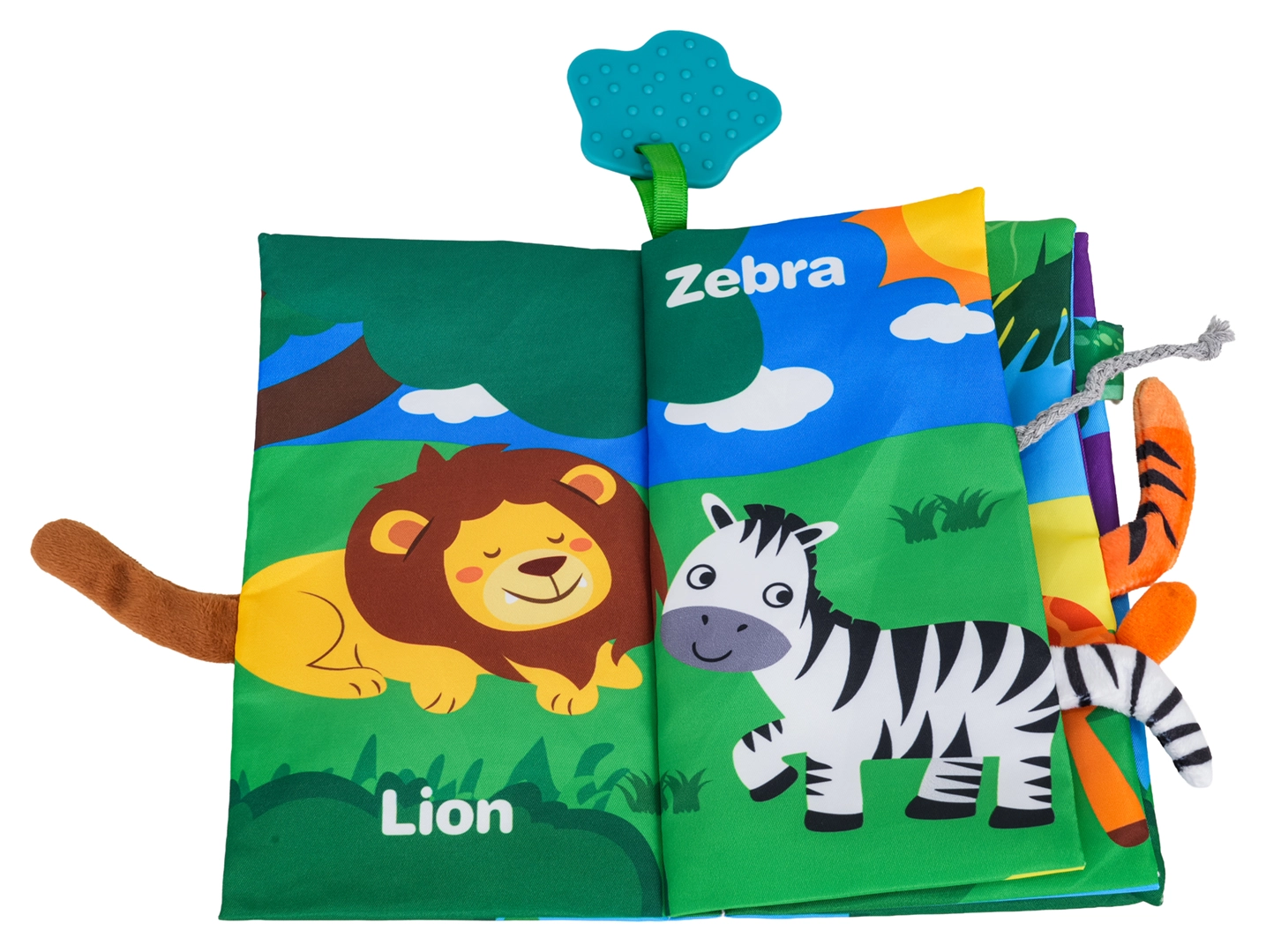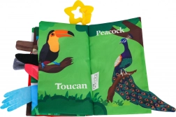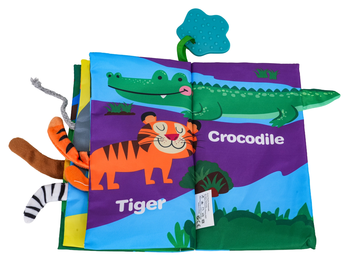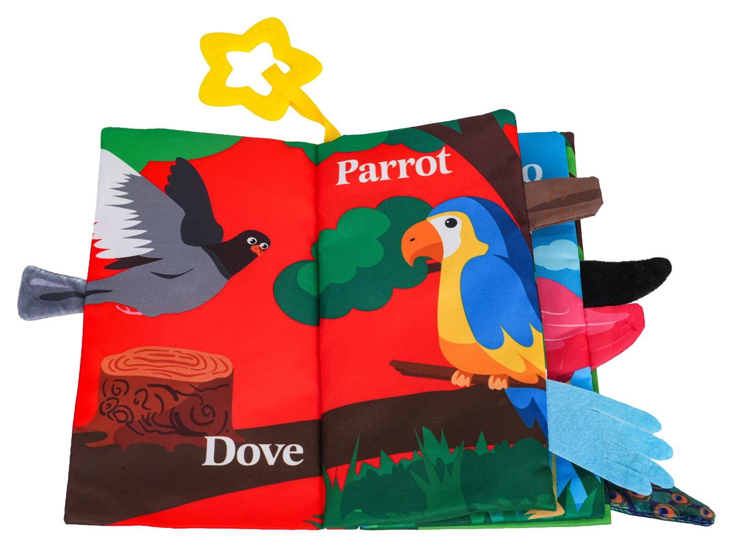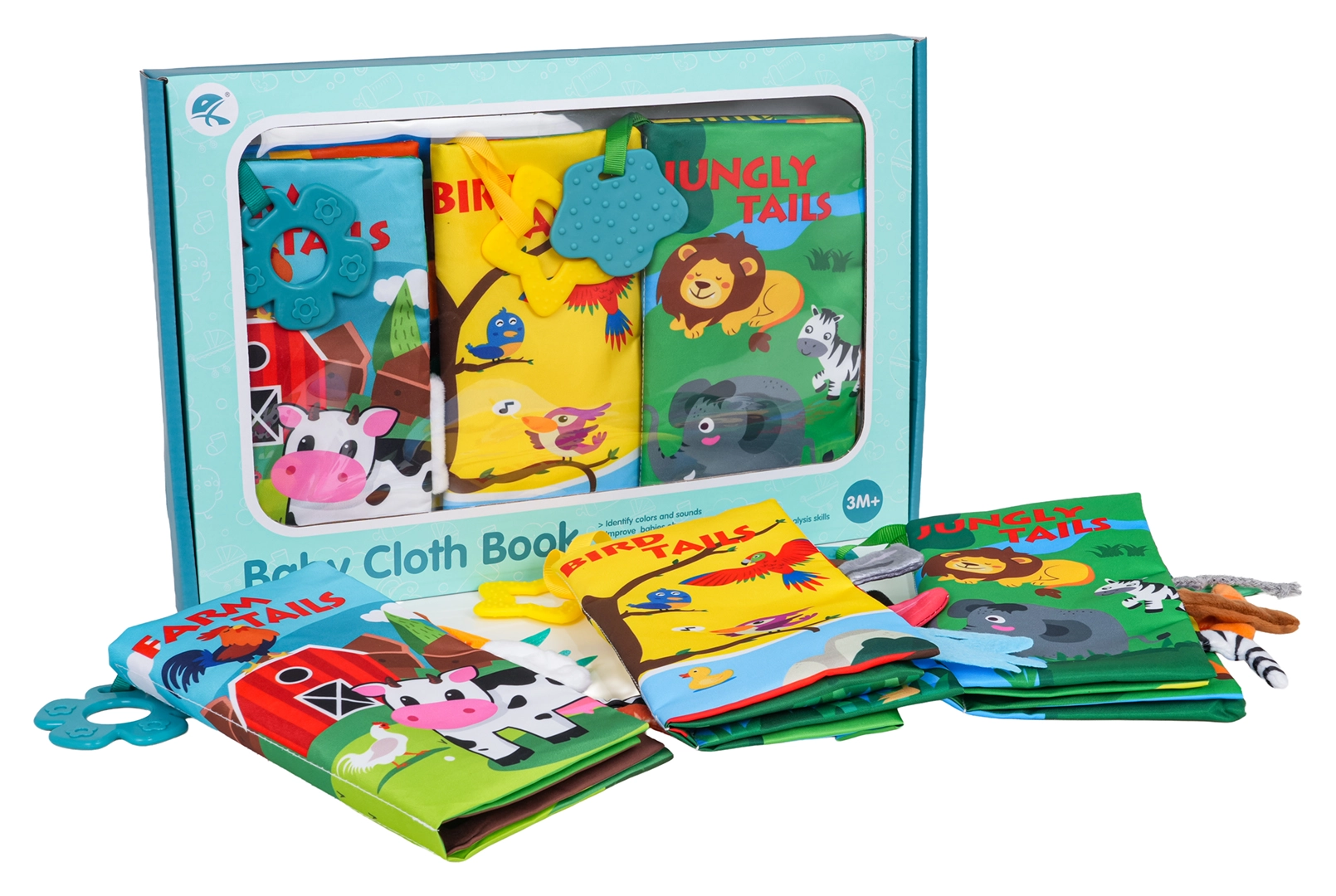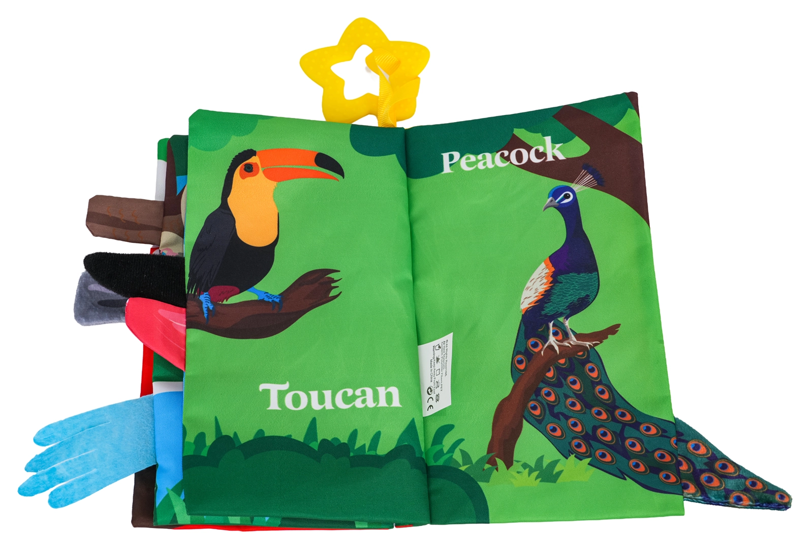 Otkrijte simpatičan set od tri platnene knjižice za djecu od 3 mjeseca, koje potiču osjetila i finu motoriku. Svaka knjižica nudi šuškave stranice, meke teksture, izbočene životinjske repiće i praktičnu grickalicu/klip za pričvršćivanje. Teme farma, ptice i džungla oduševit će živopisnim ilustracijama i jednostavnim oznakama životinja na engleskom jeziku. Platnene knjižice su lagane, vodootporne i lako se čiste – idealne za dom i putovanja.