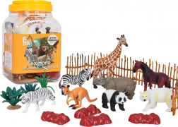 - Plastična kutija s ručkom (ambalaža); figurice: klokan, panda, polarni medvjed, tigar, nosorog, zebra, konj, žirafa; 3× biljka; 4× stijena; 7× dio ograde; priručnik s opisom životinja (EN)