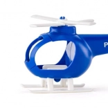 Plavi policijski helikopter s rotirajućim rotorima slijeće na krov garaže – idealno za napete priče i akcijske intervencije.