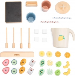 Ovaj veseli drveni set za igru donosi sve što je djeci potrebno za pripremu limunade i voćnih poslastica. Jednostavno napunite čašu, dodajte kriške voća, ukrasite slamkom i posluživanje može početi. Djeca mogu miješati različite kombinacije, smišljati vlastite recepte i razvijati maštu igrajući se piknika ili štanda s osvježenjem.
