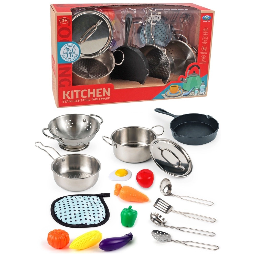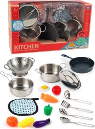 Otkrijte zabavni metalni kuhinjski set za male kuhare s ukupno 17 elemenata. U kompletu su lonac, tava, poklopci, cijedilo, kuhinjski pribor, plastično povrće i tekstilna podloga. Sjajna igračka za razvoj kreativnosti, fine motorike i igru kuhanja.