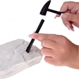 Dva dlijeta, čekić i kist omogućuju djeci postupno izbijanje i nježno čišćenje pronađene lubanje – baš kao pri pravim iskopavanjima.
