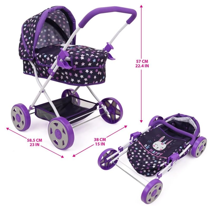 Stilskа kolica za lutke s motivom Sretni zeko razveselit će svaku malu mamu. Nude lagani sklopivi okvir za jednostavno odlaganje, mekanu pjenastu ručku visine cca 56 cm i izvlačnu tendu za zaštitu lutke. Prikladna za lutke do cca 46 cm i opremljena praktičnom košarom za kupnju.