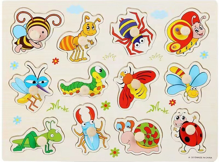 Ova kvalitetna drvena slagalica s raznobojnim motivima kukaca idealna je za prvo upoznavanje djece sa svijetom životinja. Dijelovi se lako drže i precizno uklapaju u pripremljene otvore, što potiče koordinaciju ruka–oko i strpljenje.