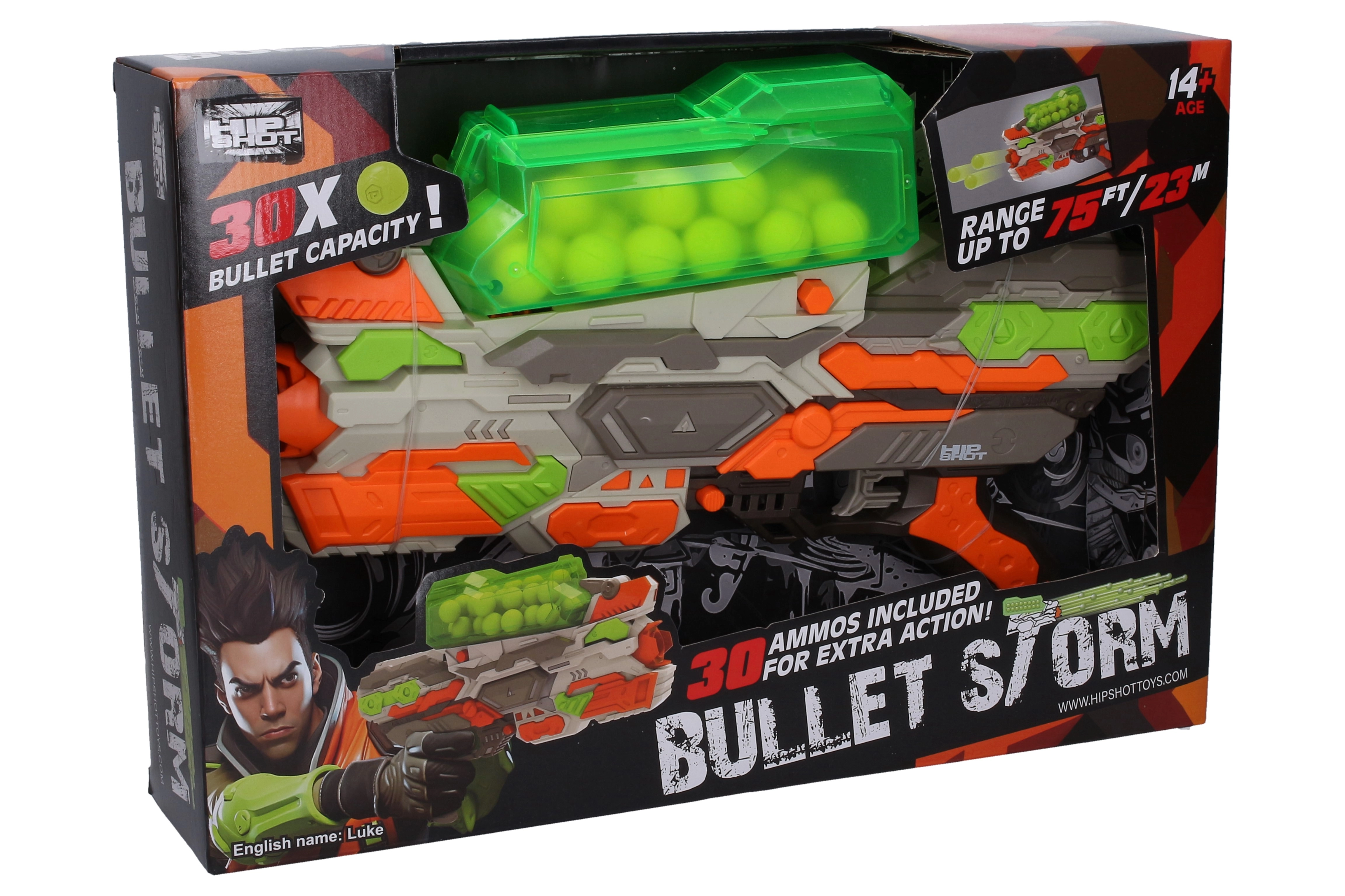 Pripremite se za akcijsku zabavu s pištoljem Bullet Storm, koji spaja sigurnost i performanse. Zahvaljujući dometu do 23 metra i zalihi od 30 mekanih pjenastih loptica uživat ćete u dugim satima igre u kući i na otvorenom. Robusna izrada i udoban hvat osiguravaju lako i sigurno rukovanje.