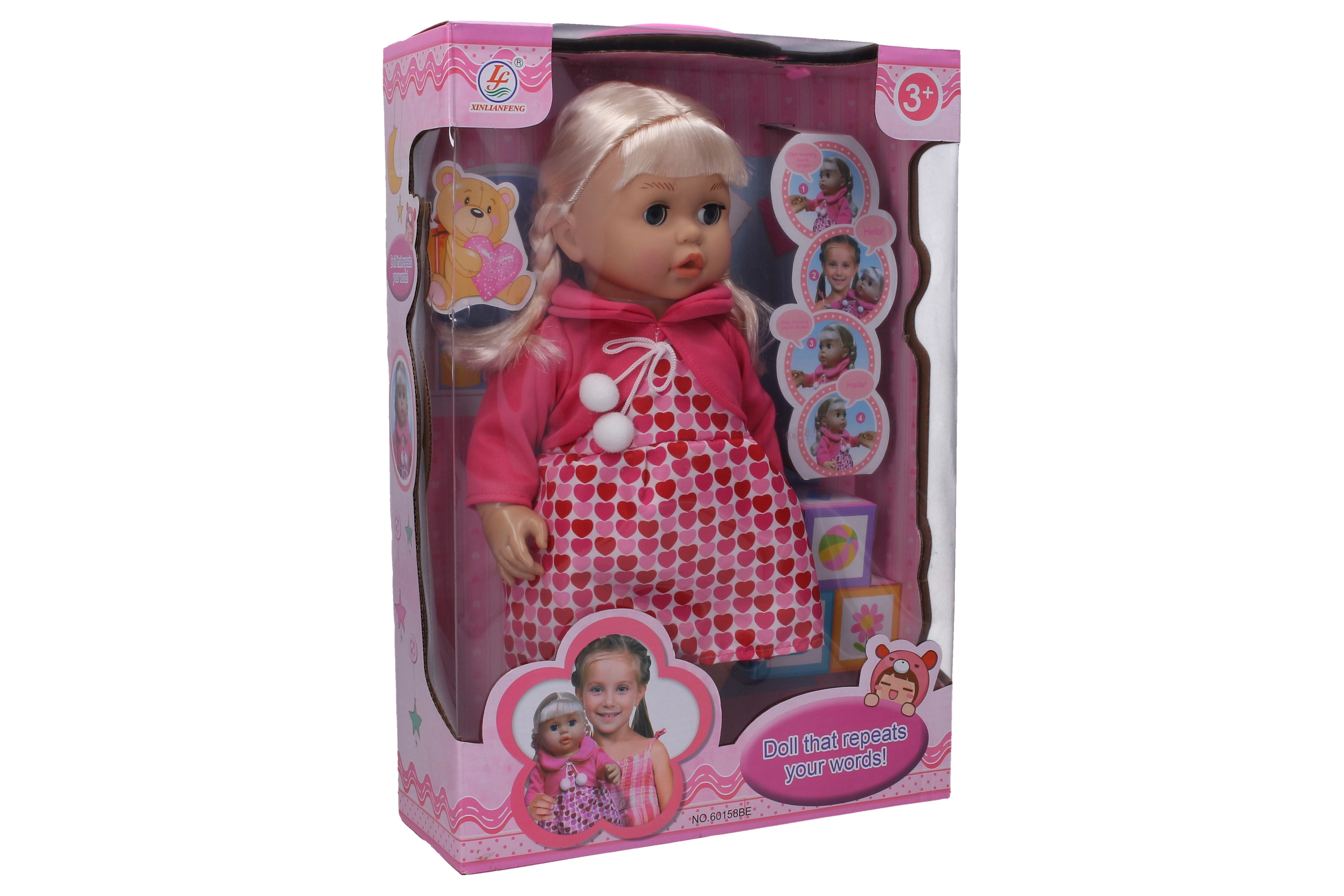 Zabavna lutka koja ponavlja što kažete! Pritiskom desne ruke pokreće se snimanje, a pritiskom lijeve ruke lutka reproducira vašu poruku. Veličina 40 cm. Interaktivna igračka za razvoj govora i zabavu. Jednostavno upravljanje pomoću tipki u rukama. Baterije 2× AA nisu uključene.