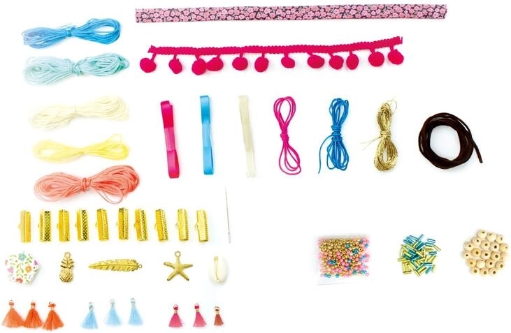 - 25 m pamučnog konca, 1,5 m voštanog konca, 100 perlica, 16 drvenih perlica, 30 perlica u tubi, 25 cm kožnog konca, 25 cm vrpce s pomponima, 3 čelična privjeska, 1 školjka, 1 tiskana perlica, 75 cm vrpce, 5 lančića s kopčom, 10 velikih kopči, 1 igla, 9 pompona, 25 cm tiskane vrpce, 5 držača za narukvicu, 2 stalka za narukvice