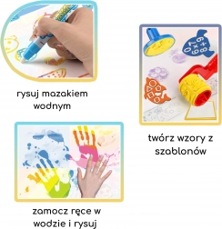 Dio seta je bogat pribor koji proširuje mogućnosti igre – od vodenih flomastera i žigova do valjka s uzorcima te šablona slova i oblika. Sve je lagano, kompaktno i prikladno za dom i putovanja.
