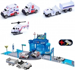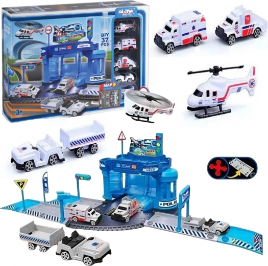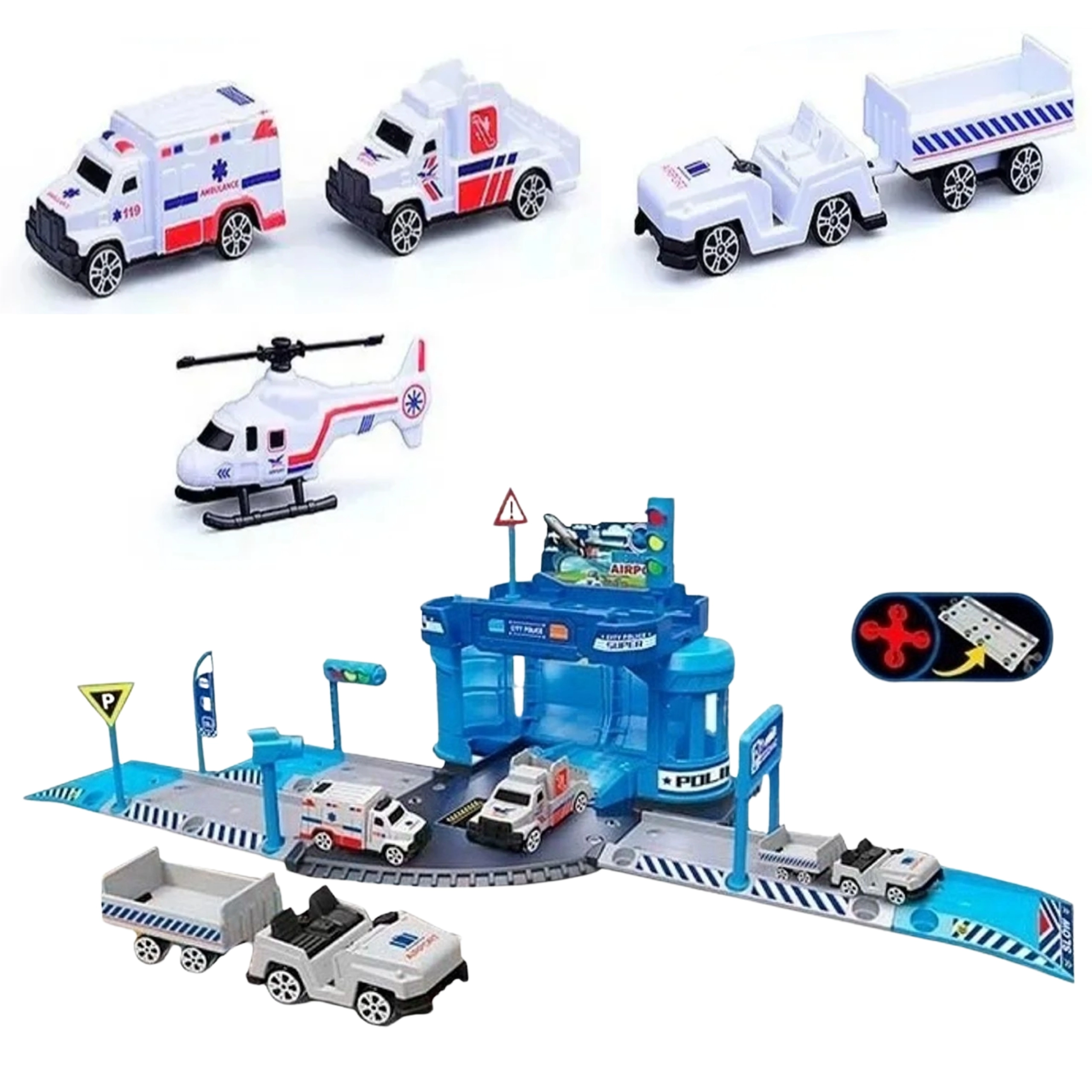 Set sadrži sklopivu zgradu postaje, policijski automobil, mali policijski helikopter, aerodromsko vozilo sa stepenicama, vozilo s prikolicom za prtljagu, prometne znakove, elemente prilazne ceste i folijsku podlogu 78 × 58 cm. Djeca razvijaju finu motoriku, koordinaciju oko–ruka i maštu.