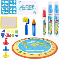 Bogata dodatna oprema u pakiranju – 3 vodena flomastera, kist, 4 šablone, 8 oblika, 3 pečata i valjak s uzorkom – donosi sate igre i učenja. Podloga je idealna za zajedničku zabavu braće, sestara i prijatelja, a prikladna je za djecu od 3 godine.