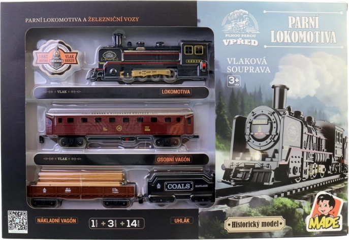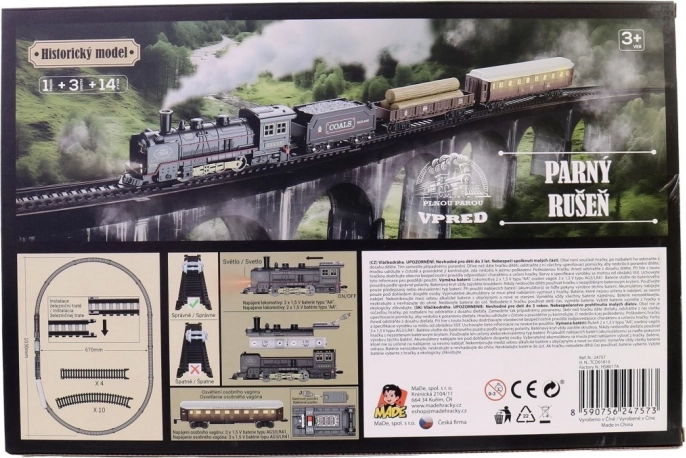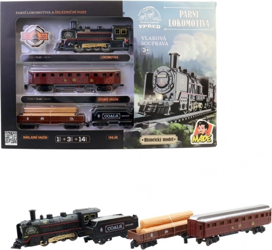 - Parna lokomotiva, tender, putnički i teretni vagon (vidi slike), tračnice i dodaci