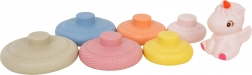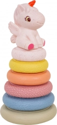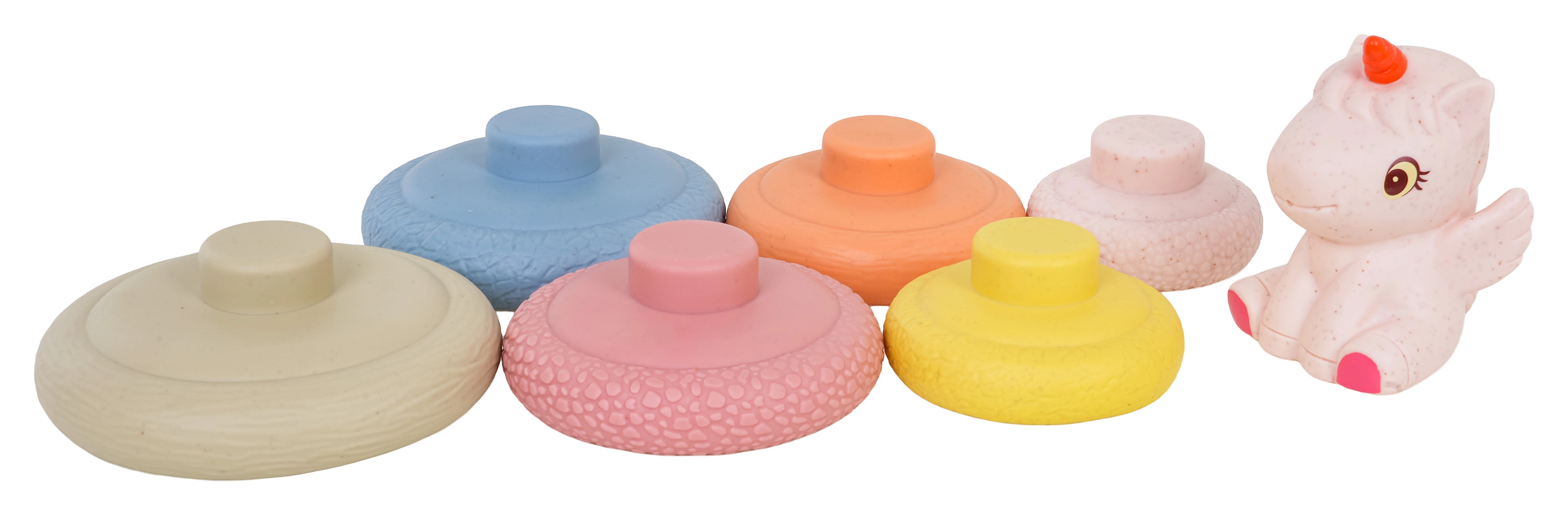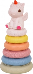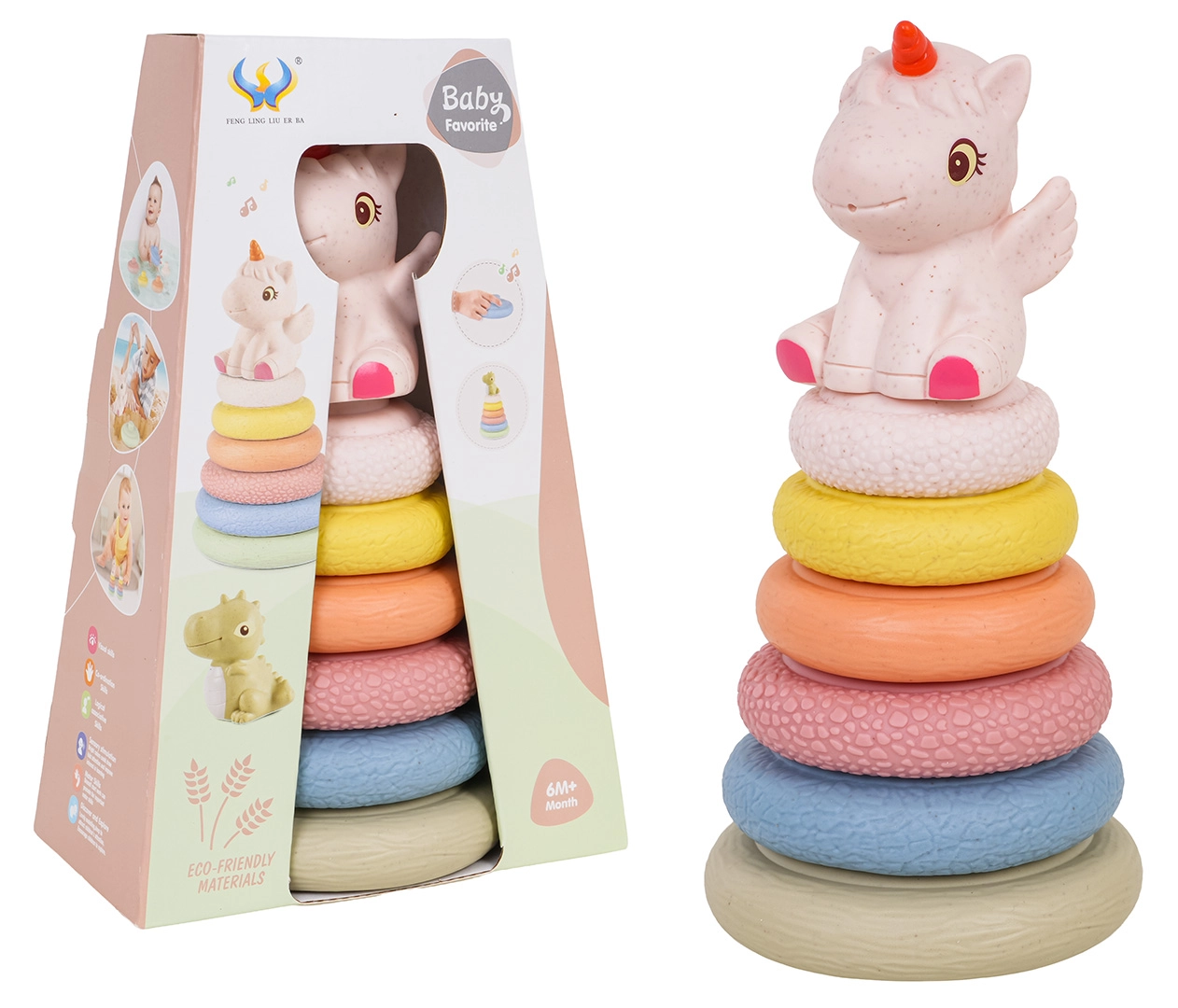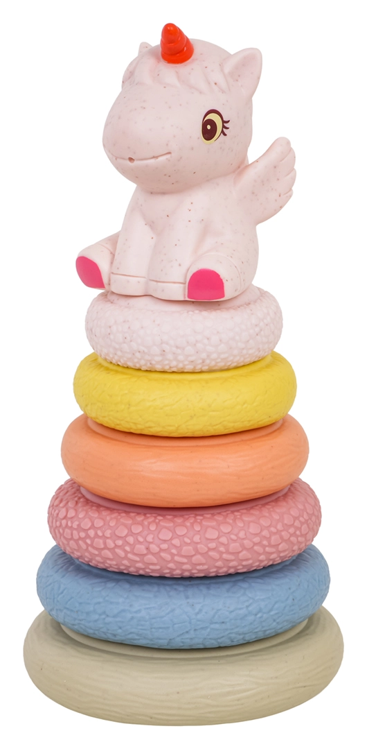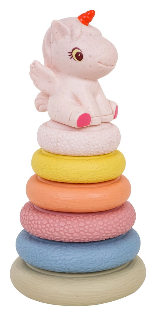 Ova eko senzorička piramida idealna je prva igračka za male istraživače. Šest lako uhvatljivih prstenova s različitim površinama uči dijete razlikovati oblike i teksture, potiče percepciju boja te prirodno vodi prema vježbanju hvata i slaganja po veličini. Slatki jednorog na vrhu pri pritisku pišti, čime povećava pažnju i motivira na daljnje istraživanje.