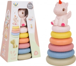 Preslatka senzorička piramida s jednorogom za bebe od 6 mjeseci razvija finu motoriku, koordinaciju oko–ruka i znatiželju. Šest pastelných prstenova s različitim teksturama potiče taktilnu percepciju, dok jednorog pri pritisku zapišti i poziva na igru. Izrađeno od eko materijala za sigurnu i smislenú zabavu.
