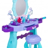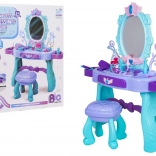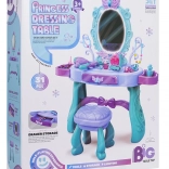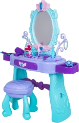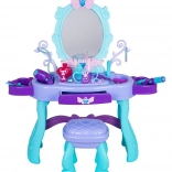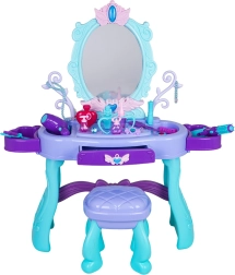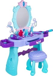 Stilski dječji toaletni stolić s velikim ogledalom, rasvjetom i bogatim setom dodataka za kreativnu igru. Uključuje stoličicu, ladicu i bočne police za pribor. U pakiranju se nalaze sušilo za kosu, uvijač i pegla, češljevi, naočale, nakit i make-up dodaci. Za svjetlo ogledala potrebne su 2× AA baterije (nisu uključene). Idealan poklon za male princeze od 3 godine.