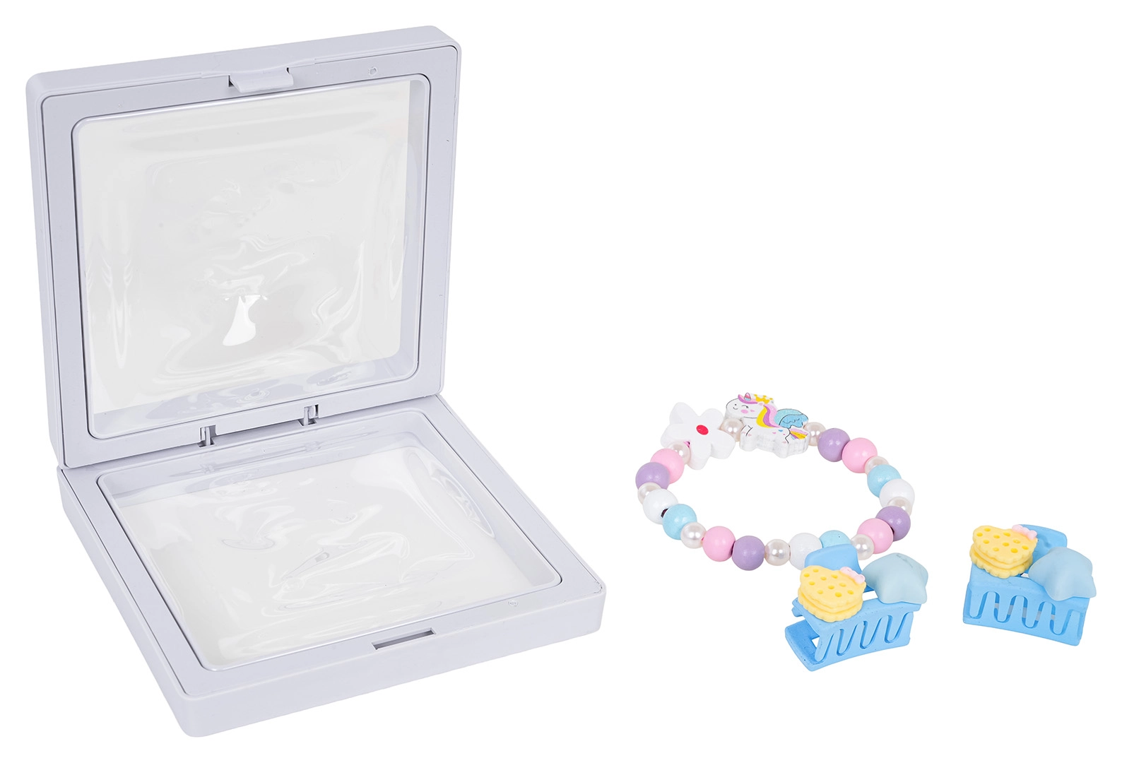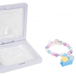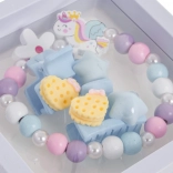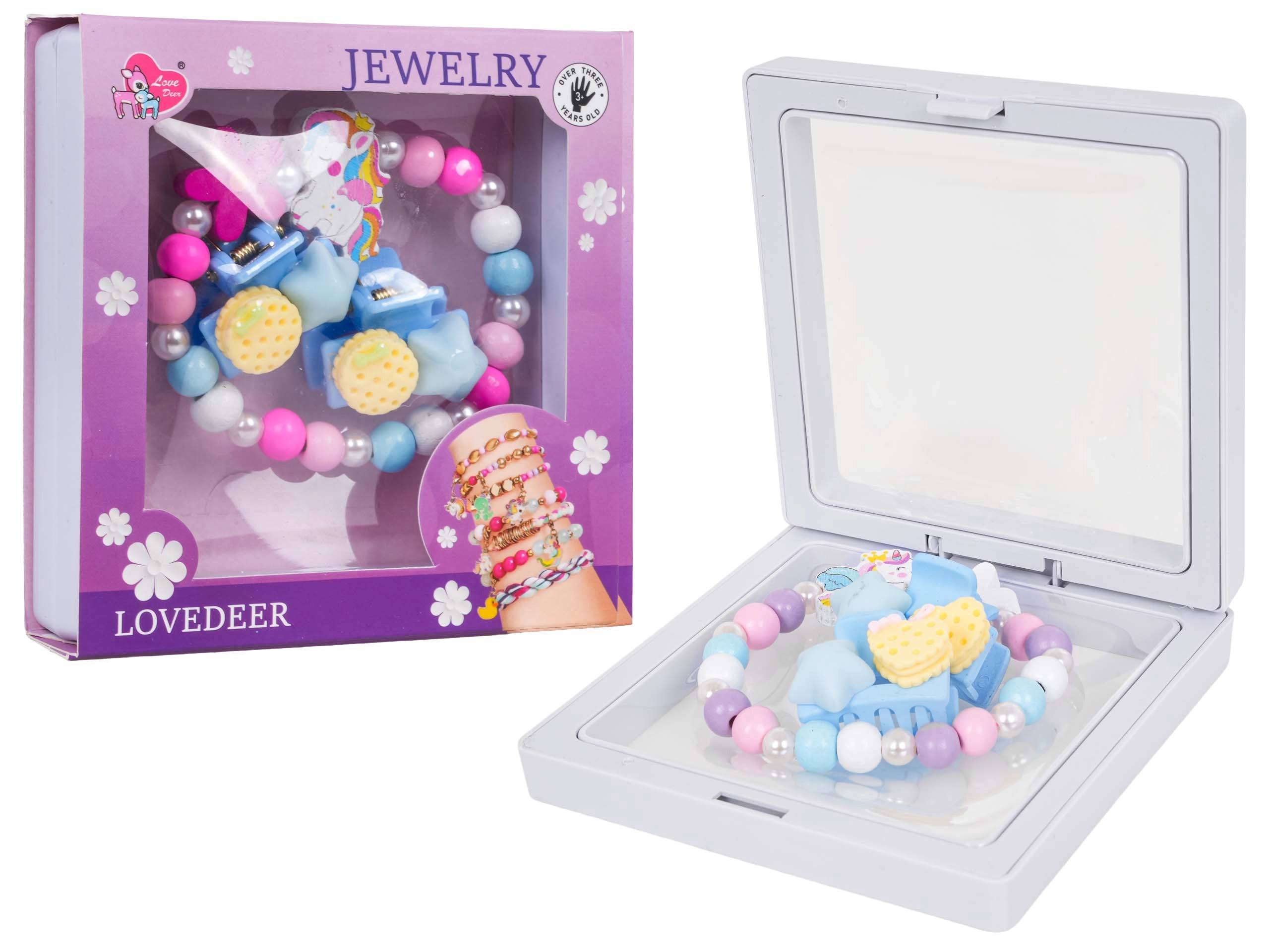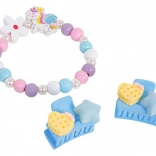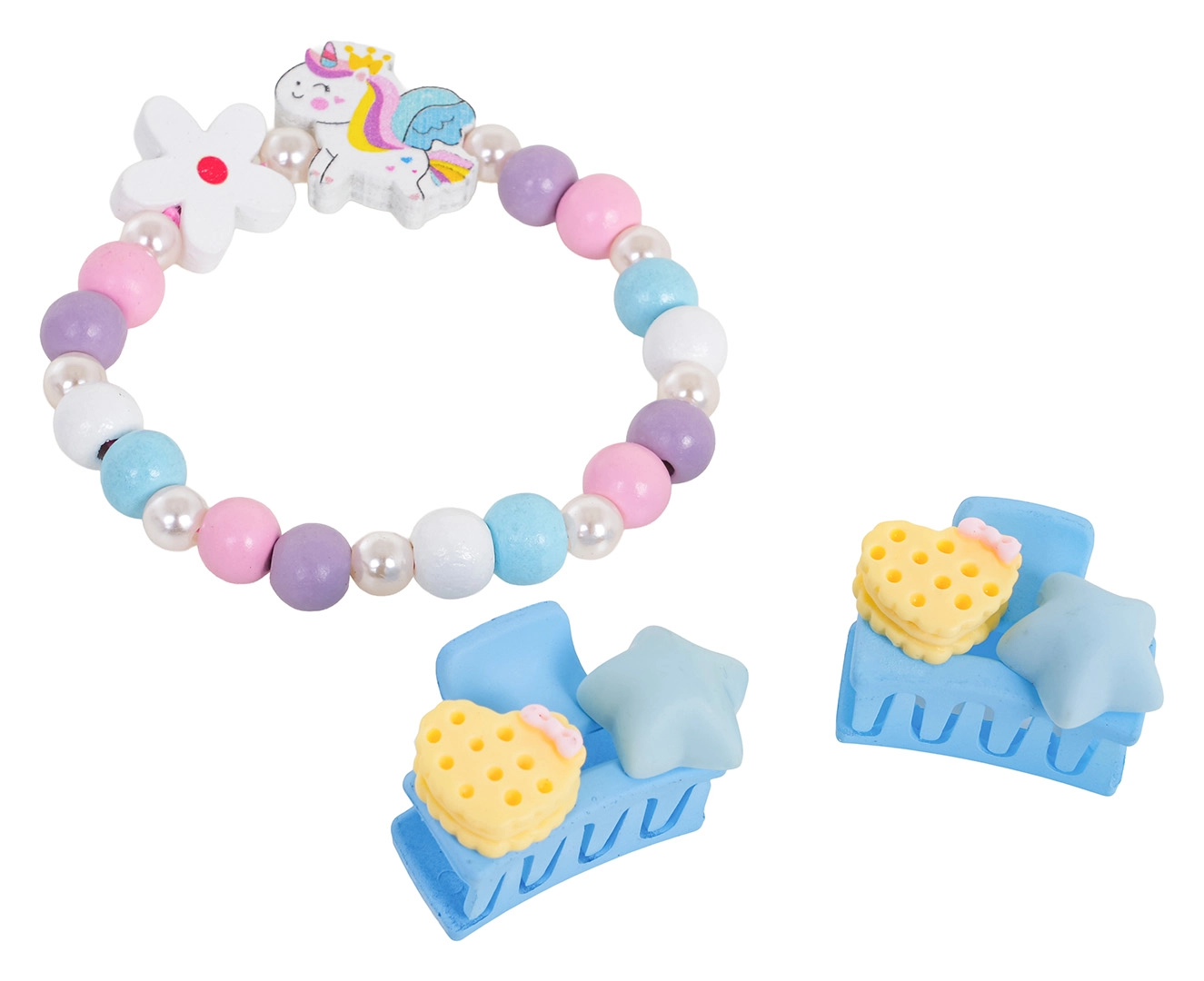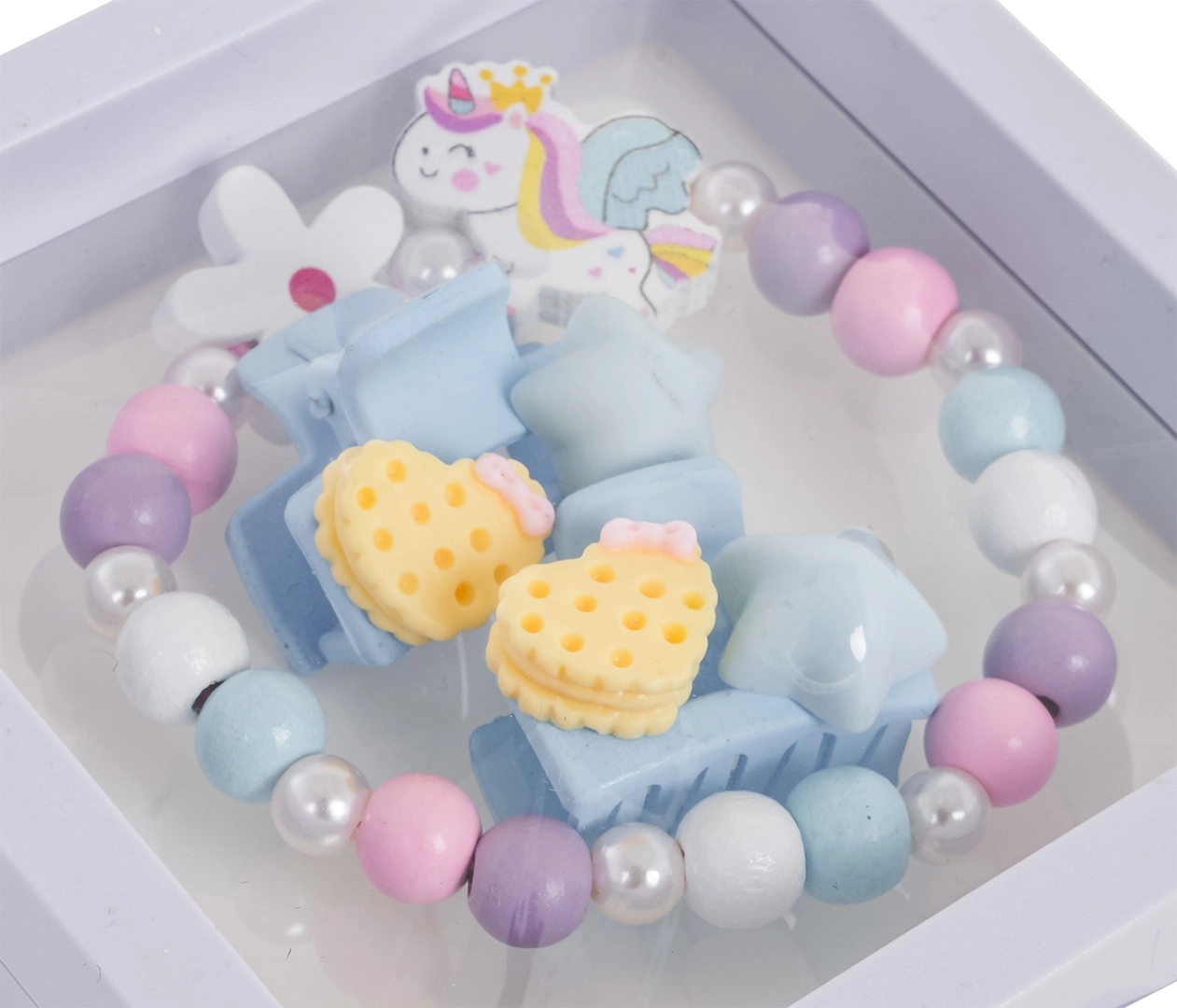 Ovaj šarmantni set za djecu spaja razigrani motiv jednoroga s nježnim bojama i ugodnim materijalima. Narukvica je izrađena od raznobojnih drvenih perli i perlica, upotpunjena slatkim privjeskom jednoroga. Dva praktična ukosnika upotpunit će svaku frizuru i potaknuti maštu tijekom igre.