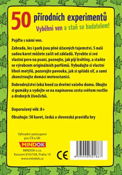Istrčite van i postanite mali istraživač! Ovaj set od 50 kartica provest će vas kroz svijet biljaka i sitnih životinja. Naučit ćete kako cvijeće pije, izradit ćete vlastito pero za pisanje, sagraditi jednostavnu meteorološku postaju i zaviriti u tajne paukove mreže. Svaki je pokus jasno objašnjen i prilagođen djeci.