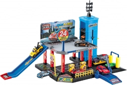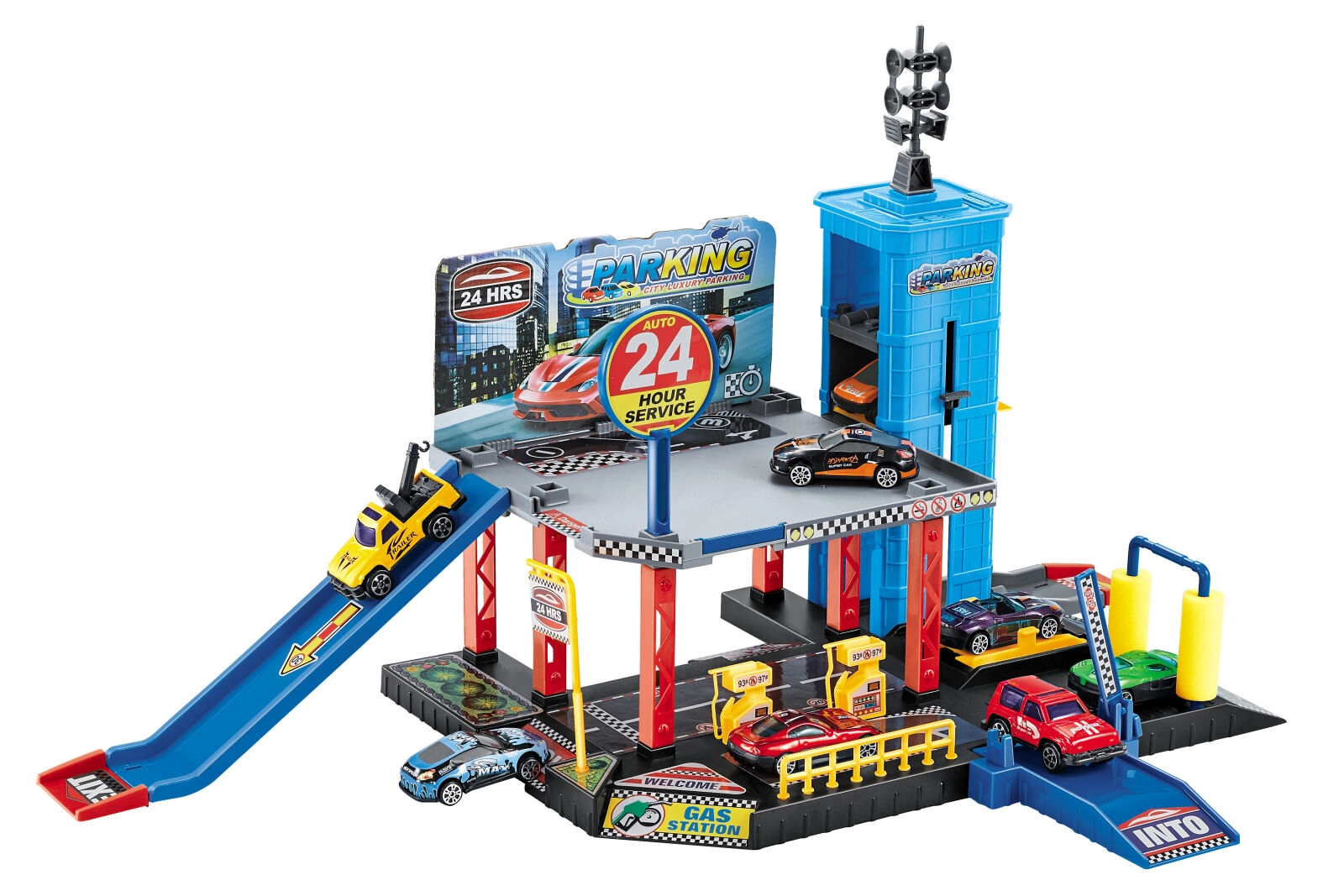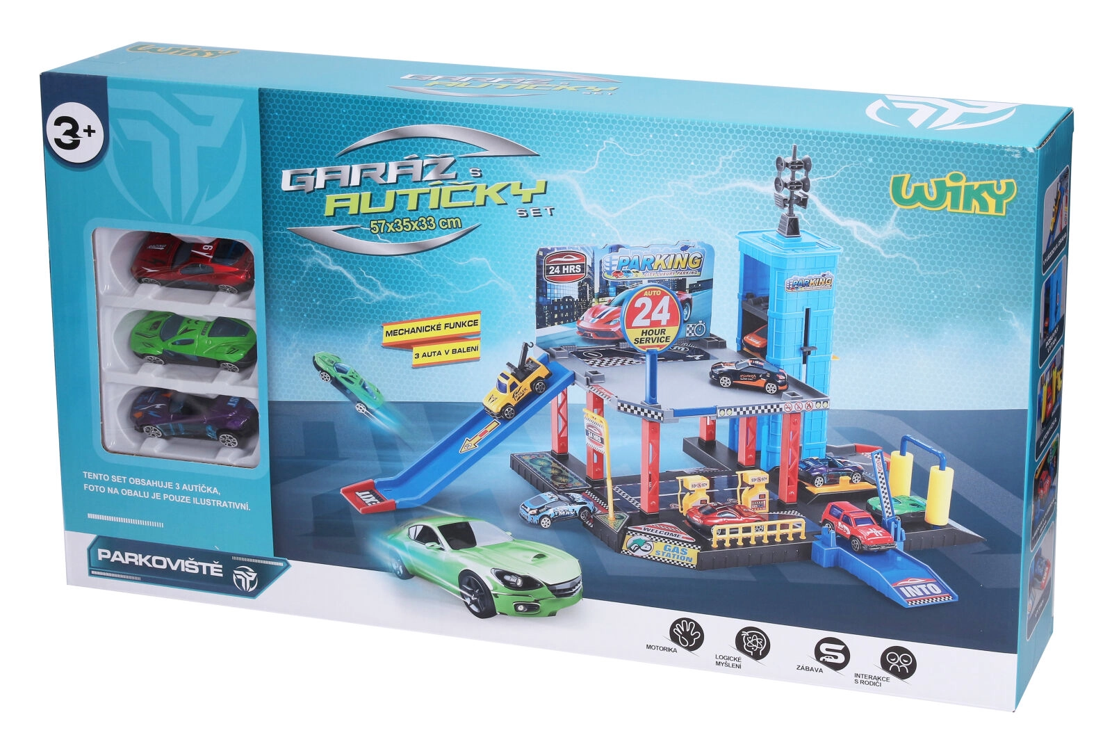 Zabavna višekatna garaža za male vozače nudi funkcionalno dizalo, benzinsku crpku i prostranu površinu za igru 57 × 35 × 33 cm. U kompletu su 3 metalna autića (7 cm) s slobodno okretajućim kotačima za glatku vožnju.
