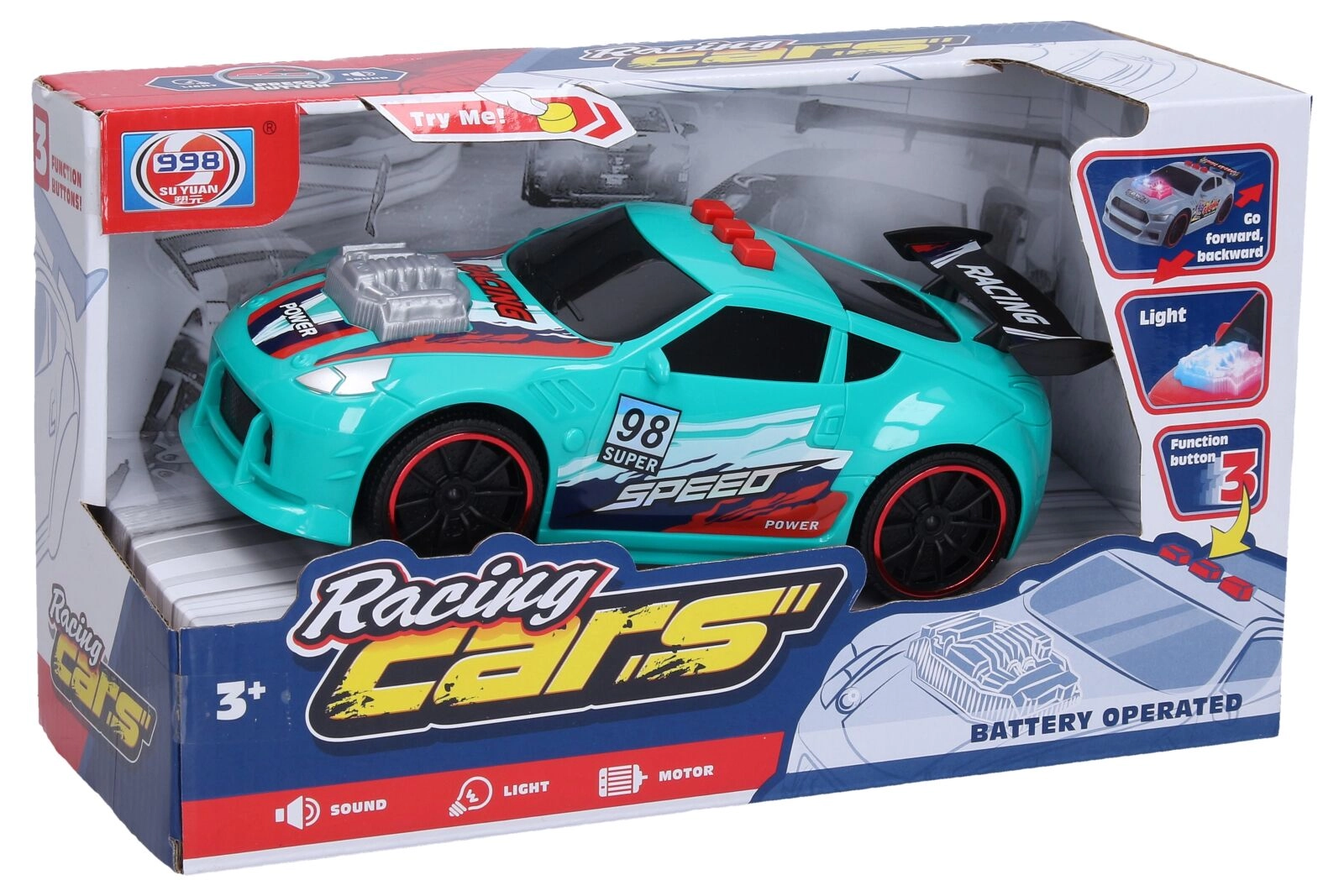 Ovaj trkaći automobil razveselit će djecu dinamičnim funkcijama i efektima koji potiču igru i maštu. Zahvaljujući trima upravljačkim tipkama na krovu lako pokrećete zvuk motora s kretanjem naprijed i naknadnim kretanjem nazad, trubljenje i zabavnu glazbu. Integrirani svjetlosni efekti pojačavaju realističan doživljaj.