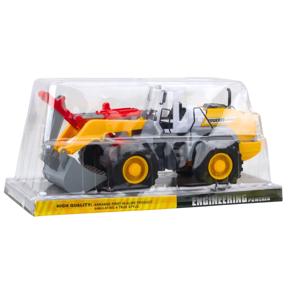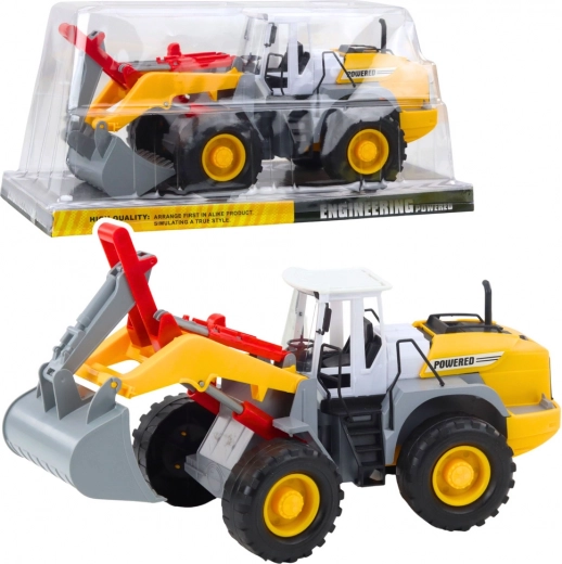 Realističan građevinski utovarivač–bager od kvalitetne plastike razveselit će svakog malog graditelja. Zahvaljujući pogonu zamašnjakom i pomičnom središnjem zglobu lako se upravlja, prednja lopata i funkcionalni klip omogućuju zahvaćanje i podizanje materijala. Izdržljiva izvedba i detaljna obrada jamče dugu i sigurnu igru kod kuće i u dvorištu.