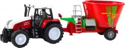 Crveni traktor s prikolicom i velikom miješalicom za stočnu hranu vjerno oponaša pravi poljoprivredni stroj. Zahvaljujući pogonu nakon potiska vozilo se samo pokreće, a priključena prikolica s miješalicom dodaje igri još više realizma – djeca mogu simulirati hranjenje životinja i svakodnevna zbivanja na farmi.