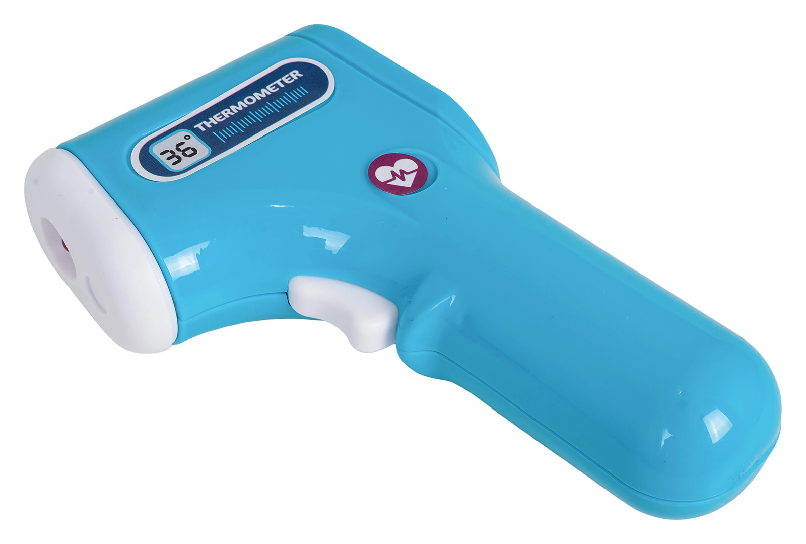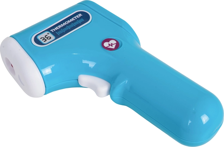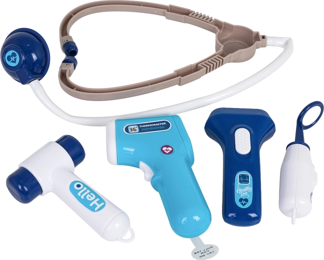 Stetoskop, beskontaktni termometar sa svjetlom, šprica, škare, pinceta, zrcalce, čekić, naočale, kartica pacijenta i drugi dodaci za kreativnu igru.