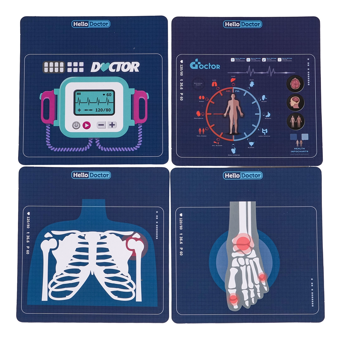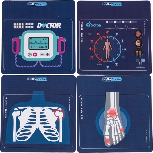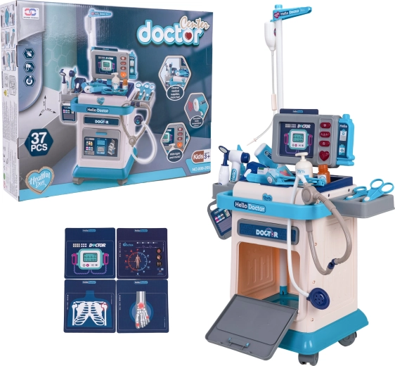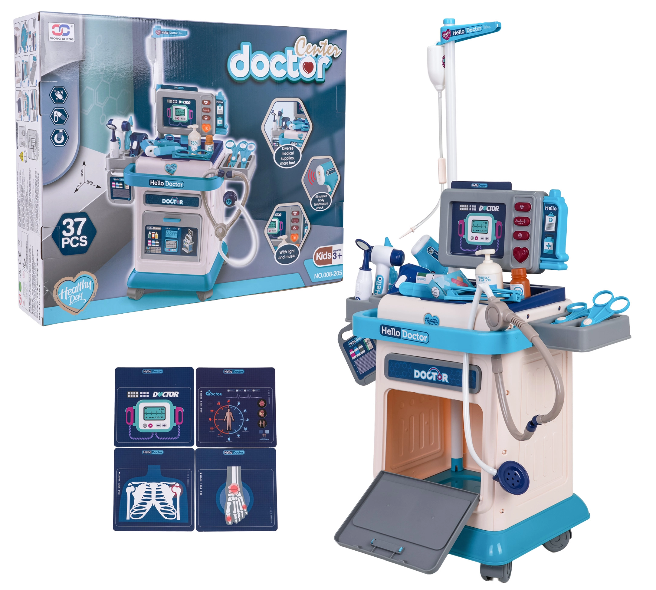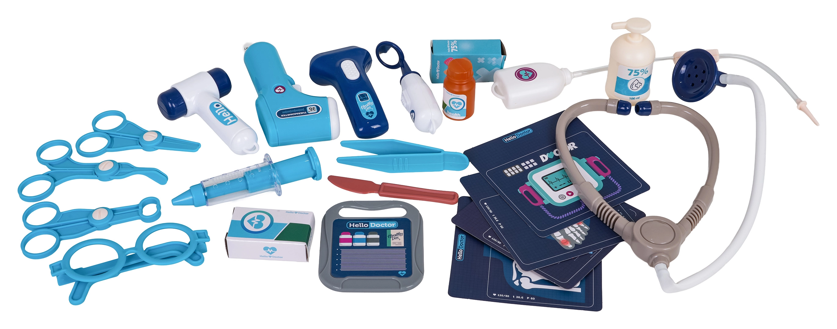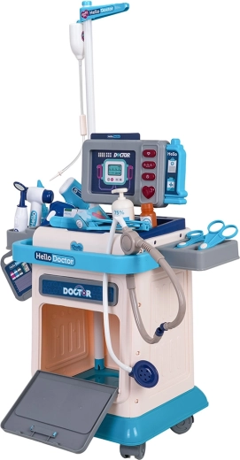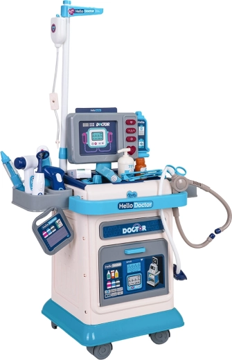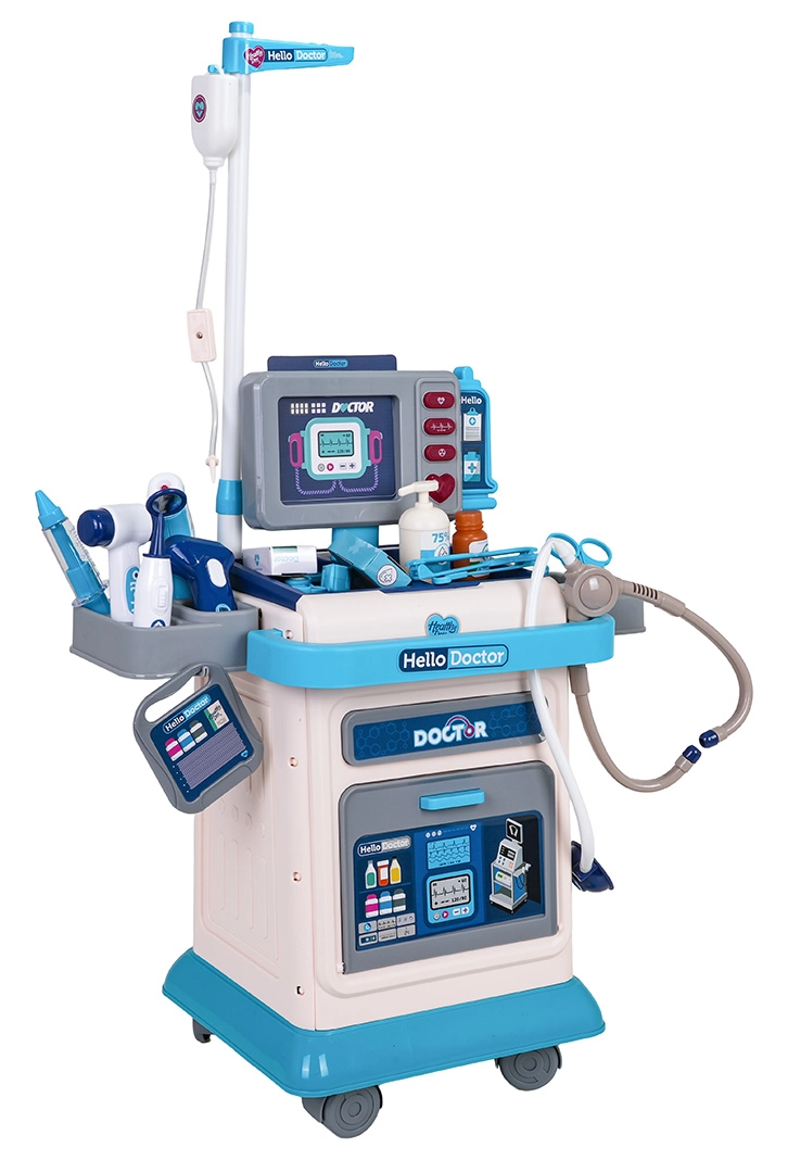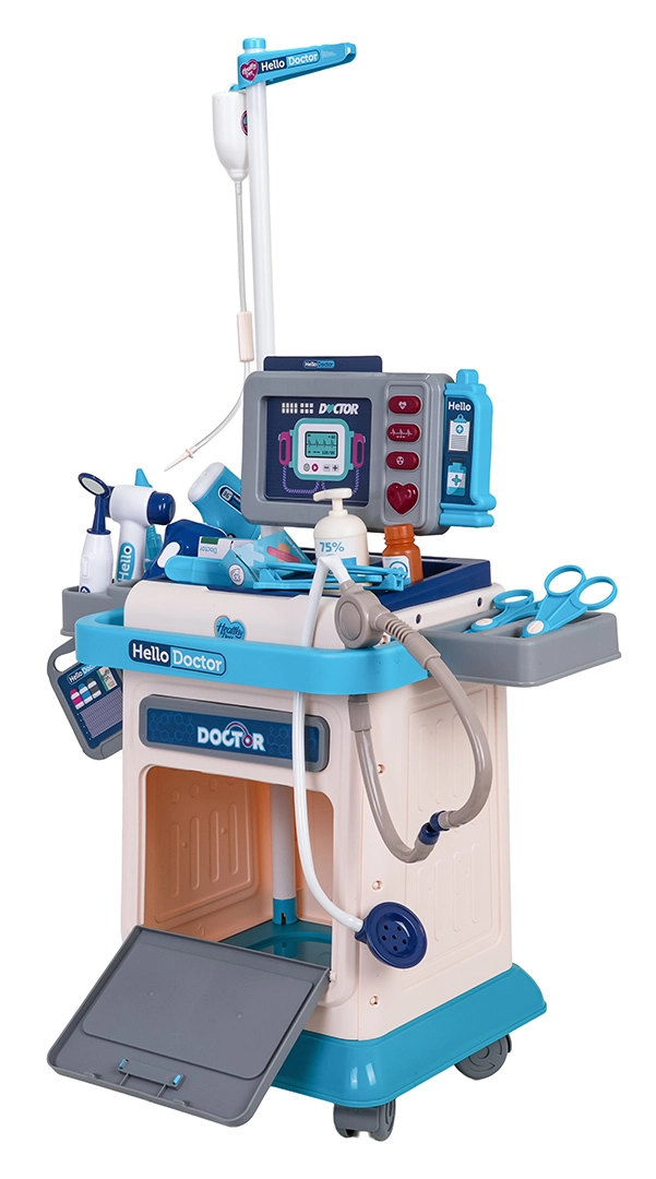 Djeca u setu pronalaze sve potrebno: stetoskop, beskontaktni termometar sa svjetlom, špricu, škare, pincetu, zrcalce, neurološki čekić, naočale te male dodatke poput kartice pacijenta, bočice s "dezinficijensom", kutijice s flasterima i lijekovima ili IV stalka. Kolica imaju praktičnu ladicu i držače za pregledno odlaganje alata.