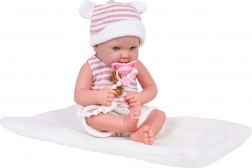 Slatka beba lutka za djecu od 3 godine oduševit će realističnim izgledom i mekim tkaninama. U kompletu su duda na vrpci i mekani mačić za maženje. Lutka ima pokretne ruke i noge, meku odjeću i izvrsna je kao poklon za male skrbnike.