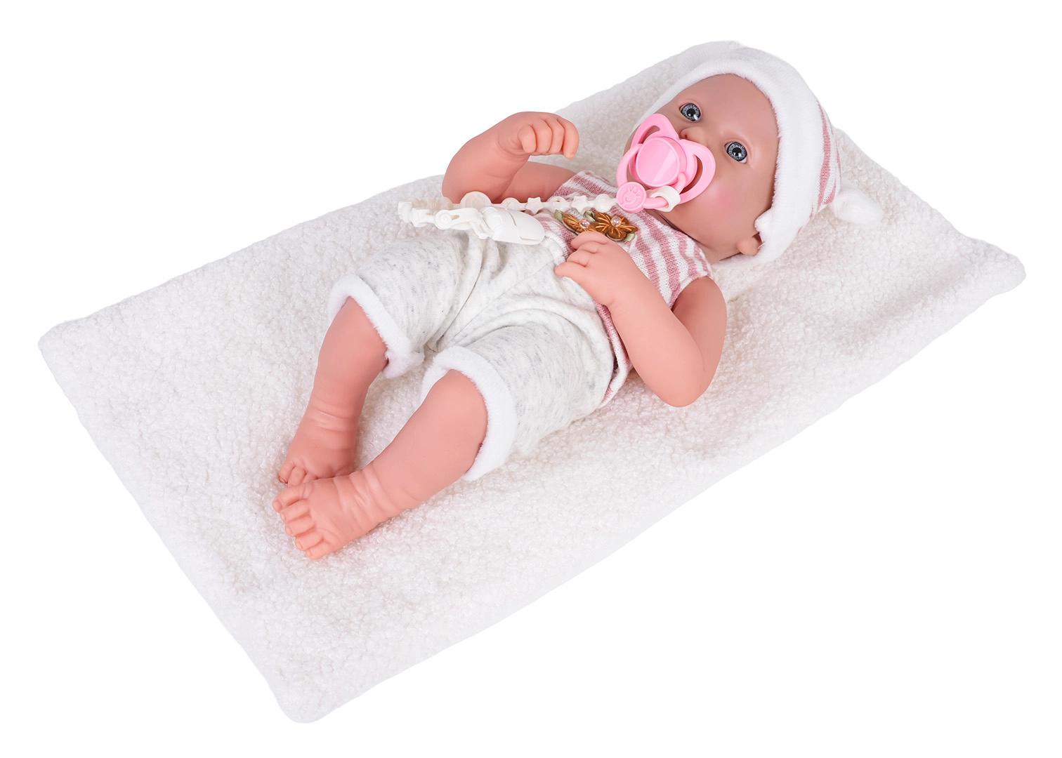 U pakiranju je sve što djeci treba za igru: duda na vrpci za umirivanje bebe i mekana dekica za presvlačenje ili uspavljivanje. Lutka je prikladna od 3 godine, ima odjeću koju je lako skinuti (kapica, majica i kratke hlače) i jednostavna je za održavanje.