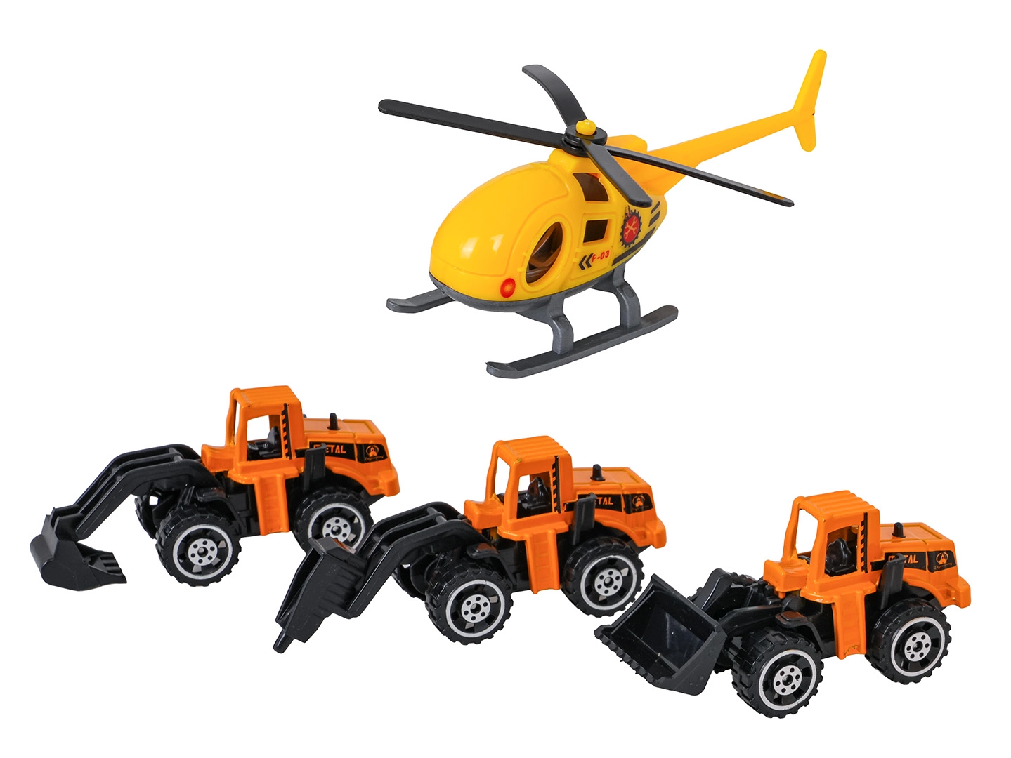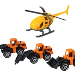 Dio pakiranja su 3 metalna građevinska autića s pomičnim elementima i helikopter, prometna signalizacija, barijere i dekorativne naljepnice. Zahvaljujući robusnoj izradi i sigurnim materijalima, set je prikladan za svakodnevnu igru te potiče finu motoriku, maštu i suradničku igru.