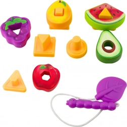 - Podloga 20 × 20 cm, šareni voćni dijelovi s geometrijskim oblicima, gusjenica za provlačenje, praktično pakiranje