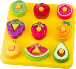 Ova edukativna slagalica s motivom voća spaja zabavu i učenje. Na podlozi dimenzija 20 × 20 cm djeca pridružuju obojene dijelove s geometrijskim oblicima odgovarajućim otvorima, čime prirodno usvajaju prepoznavanje boja, oblika i voća. Dio seta je i „gusjenica” za provlačenje, koja dodatno potiče finu motoriku i koncentraciju.