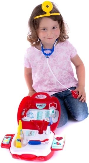 Zabavni doktor set za male liječnike u praktičnom koferčiću nudi sve potrebno za igru doktora. Potiče maštu, igre uloga i finu motoriku djece. Zahvaljujući laganim plastičnim alatima, kao što su stetoskop, toplomjer i injekcija, djeca se mogu sigurno okušati u pregledima i brizi za pacijente.