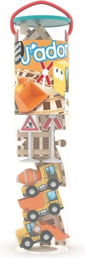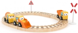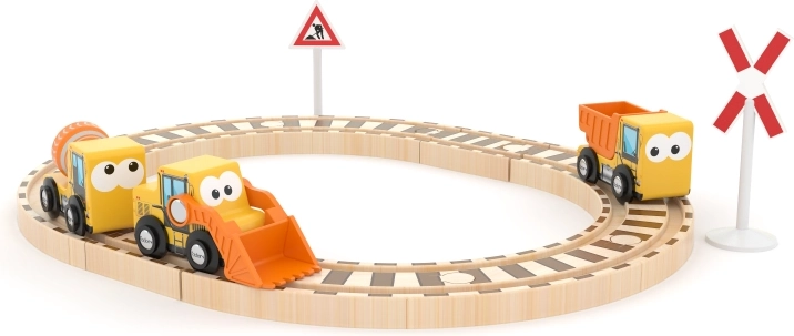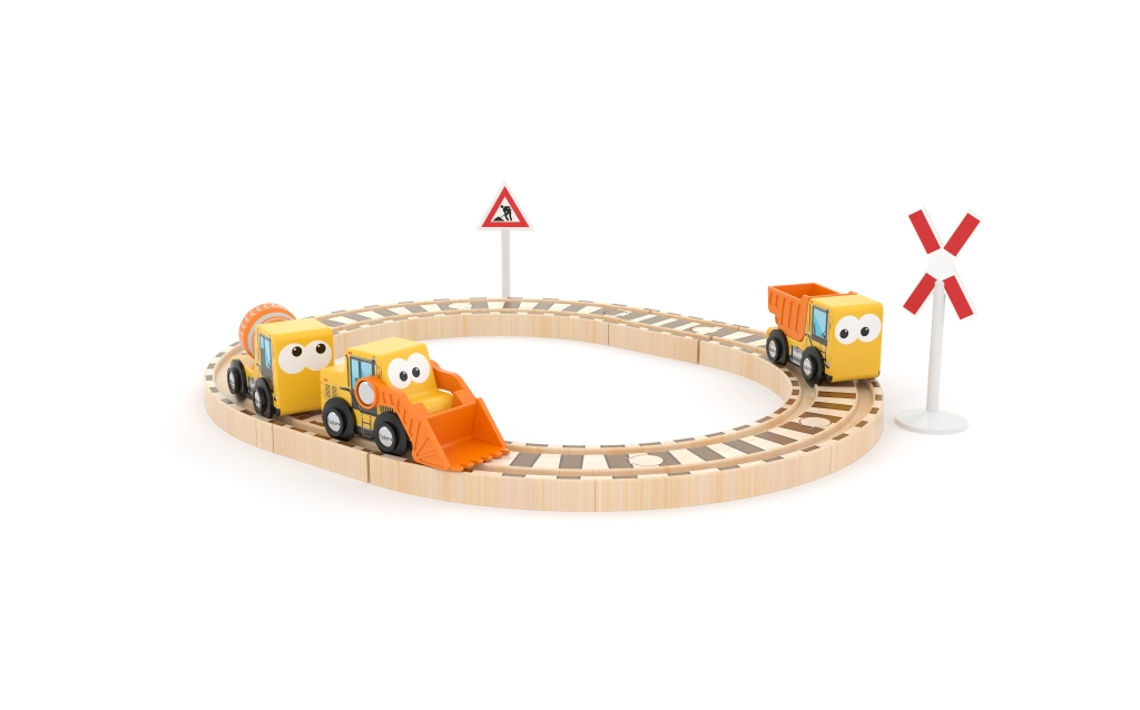 Ovaj kvalitetni drveni set spaja svijet vlakova i gradilišta u jedno igraće iskustvo. Djeca mogu posložiti tračnice, uključiti građevinske strojeve i stvarati vlastite priče s gradilišta. Sigurni materijali i glatka obrada jamče ugodnu i sigurnu igru.