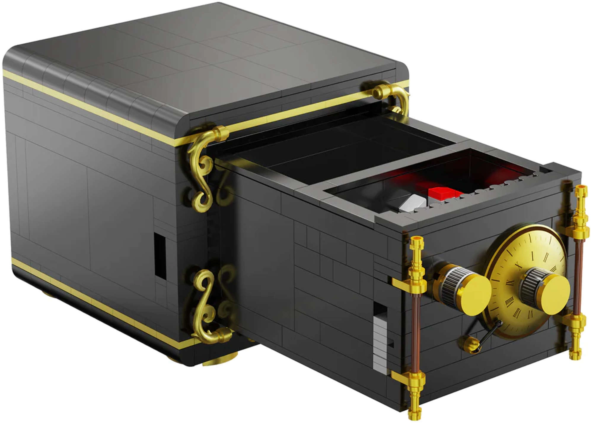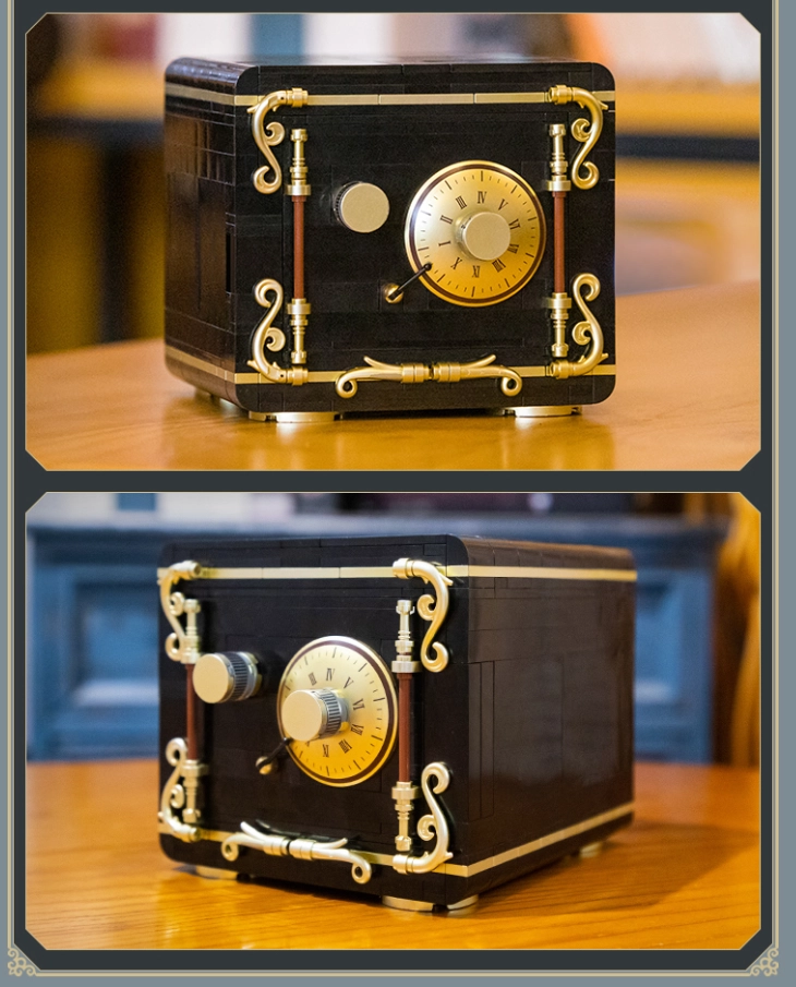 Sef je u crnoj boji sa zlatnim akcentima, glavni upravljač s rimskim brojkama olakšava postavljanje koda, a autentični klikajući zvuk pri okretanju povećava dojam realističnosti. Set potiče koordinaciju oko–ruka, kreativnost i strpljenje, a zahvaljujući kompatibilnosti dijelova lako ga proširite drugim modelima.