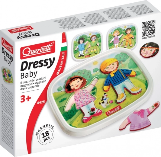 Magnetična igra oblačenja QUERCETTI Dressy Baby donosi djeci radost otkrivanja i stvaranja. Zahvaljujući 18 magnetskim dijelovima mogu smišljati bezbroj kombinacija odjeće, uvježbavati maštu i razvijati važne vještine kroz igru. Čvrsti magneti osiguravaju da dijelovi tijekom igre dobro ostaju na mjestu.