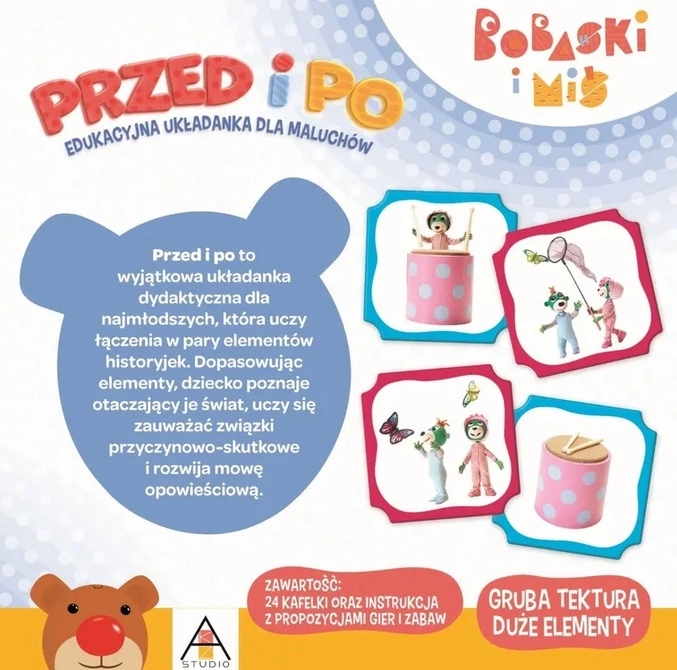 Edukativna slagalica „Prije i poslije” spaja učenje i zabavu. Šarene ilustracije s likovima iz serije BOBASKI I MIŚ potiču djecu na pripovijedanje vlastitih priča i razumijevanje uzročno-posljedičnih veza. Dijelovi su dizajnirani za lako držanje malim dlanovima i otporni su na često korištenje.