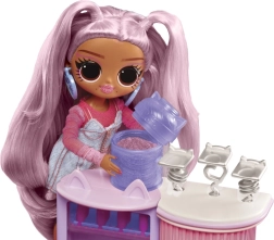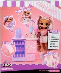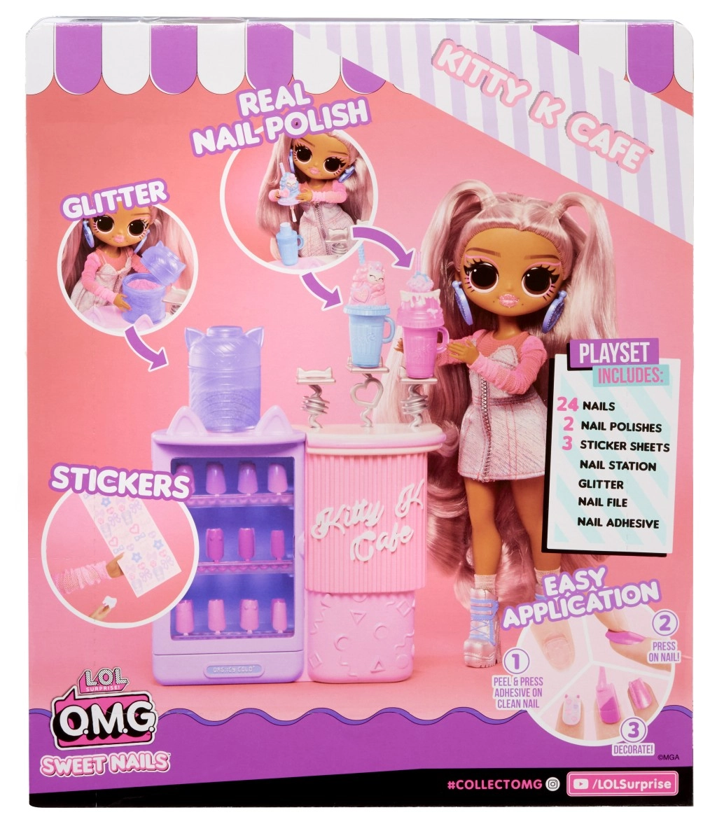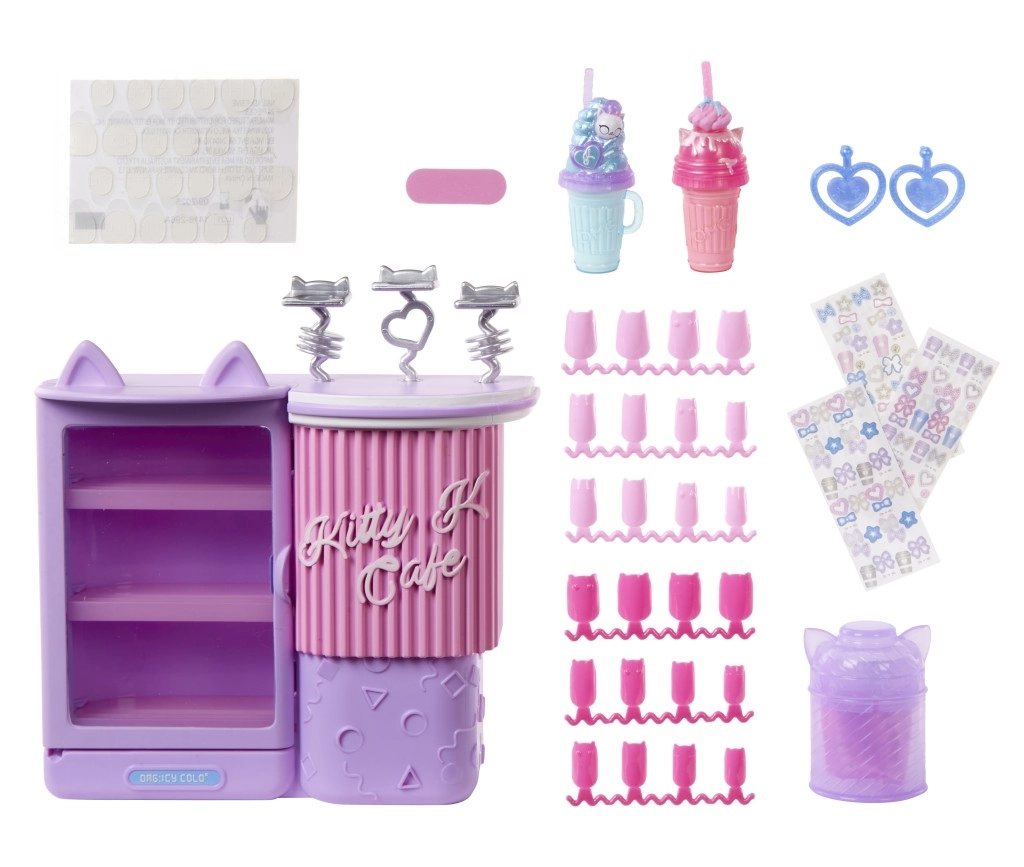 Set sadrži modnu lutku s dugom pastelnom kosom i artikuliranim tijelom za sjajno poziranje, kafić pult Kitty K Cafe s dodacima za posluživanje napitaka te bogat set dekoracija za nokte. Idealno za kreativnu igru, kolekcionare i izlaganje.